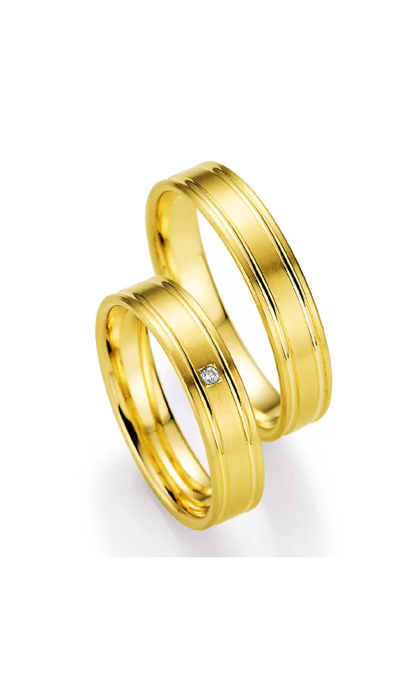 Zlaté snubné prstene vyrobené zo žltého štrnásťkarátového zlata - 585/000 s jedným okrúhlym diamantom briliantového brusu vsadeným v dámskom prsteni. Snubné prstene majú rovný profil s vnútorným fit profilom - zaoblenie vnútorných stien prsteňov. Diamanty oplývajú svojou krásou a vlastnosťami, ktoré sú oproti iným kameňom bezkonkurenčné. Je to najtvrdší nerast, ktorý nikdy nestratí svoju hodnotu. Diamant je kráľ všetkých drahokamov a teda aj jedným z najcennejších a preto sa oplatí do šperkov s diamantmi investovať a predovšetkým pri snubných prsteňoch, ktoré sú na celý život! Vsadzovanie diamantov vykonávajú naši najskúsenejší majstri zlatníci ručne pod mikroskopom s presnosťou na 0,01 mm a preto nehrozí vypadnutie kamienkov ako to býva u strojne vyrábaných snubných prsteňov. Snubné prstene majú vnútorný fit profil - zaoblenie vnútornej strany prsteňov pre príjemnejšie nosenie.
