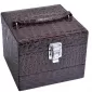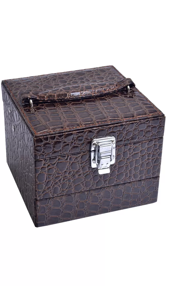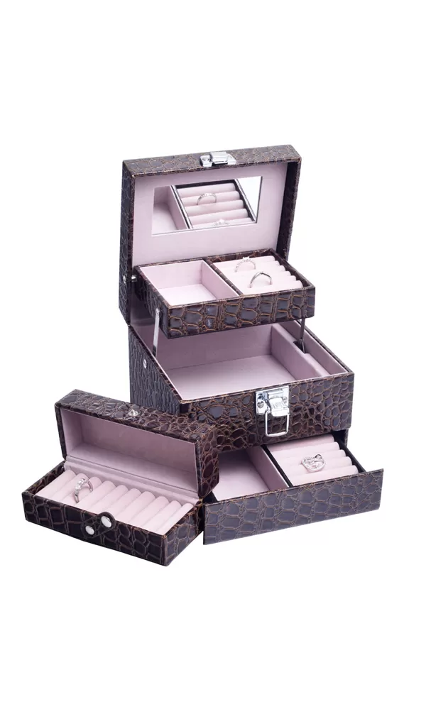 Nielen nádherná ale aj veľmi praktická šperkovnica potiahnutá kvalitnou koženkou v hnedej farbe uschová Vaše šperky vo veľmi priestrannom úložnom priestore. Šperkovnica má tri poschodia, kde ľahko uschováte náušnice, prstene, prívesky a retiazky. Šuplíky sú opatrené kovovými úchytkami pre ľahkú manipuláciu. Súčasťou je malá cestovná šperkovnička so zapínaním na patent.