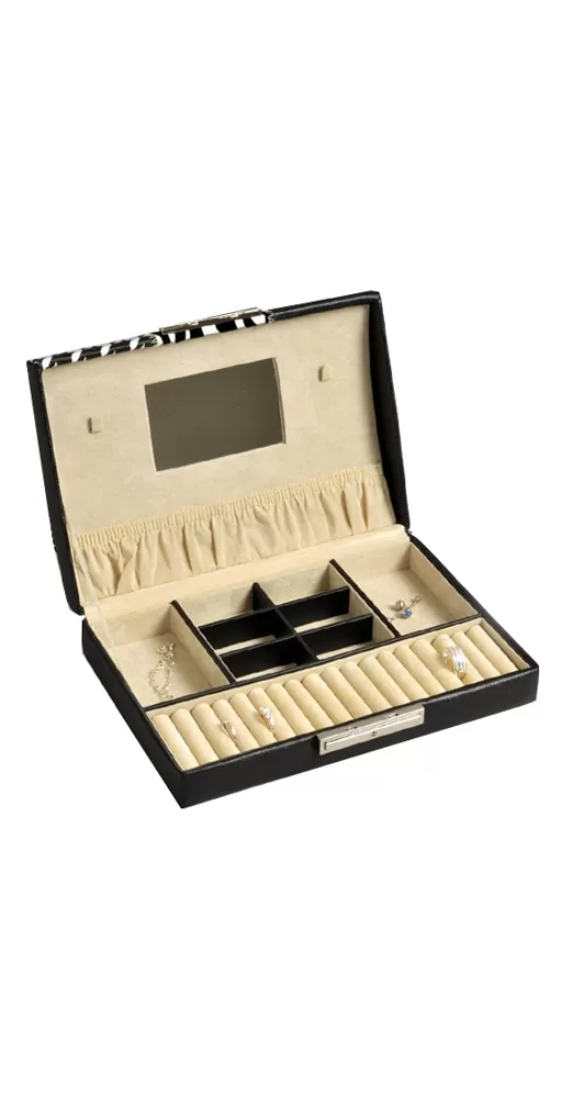 Vnútorné usporiadanie šperkovnice umožňuje pohodlné uloženie prsteňov, náušníc, príveskov a ďalších šperkov. Vo veku nechýba dostatočne veľké zrkadlo a vrecko na ďalšie drobnosti. Šperkovnica je uzamykateľná.