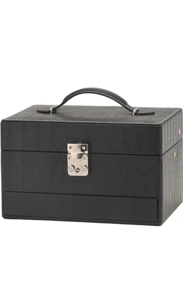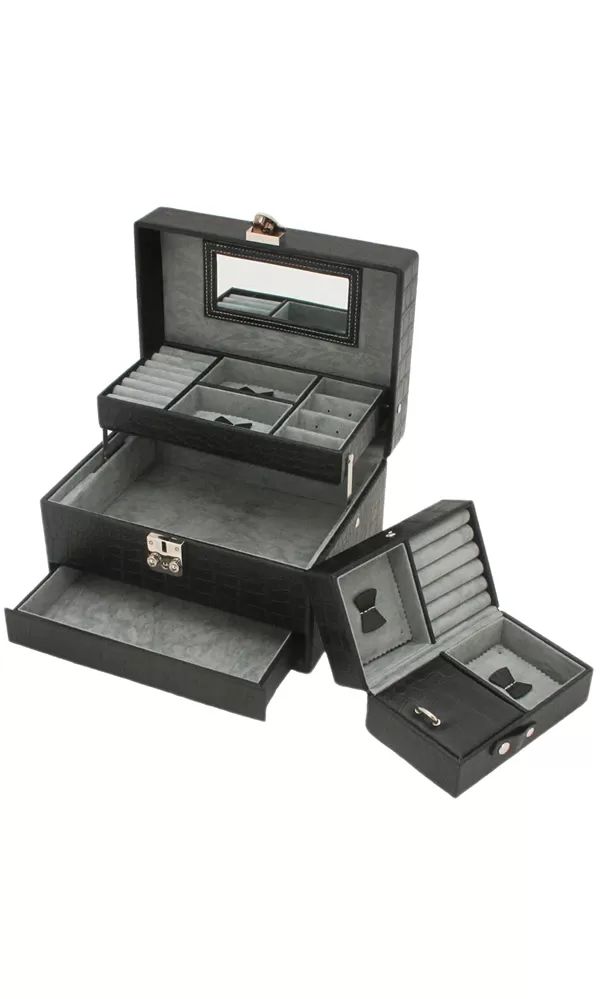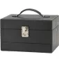 Šperkovnica s moderným dizajnom má povrch potiahnutý syntetickou kožou čiernej farby. Je opatrená kovovým otváraním striebornej farby s možnosťou uzamknutia kľúčikom. Súčasťou šperkovnice je oveľa menšia cestovná šperkovnica. Svoje obľúbené šperky tak budete mať vždy po ruke aj na cestách. Po otvorení šperkovnice sa automaticky vysúvajú tri poschodia. Máte tak skvelý výhľad na všetky šperky.