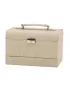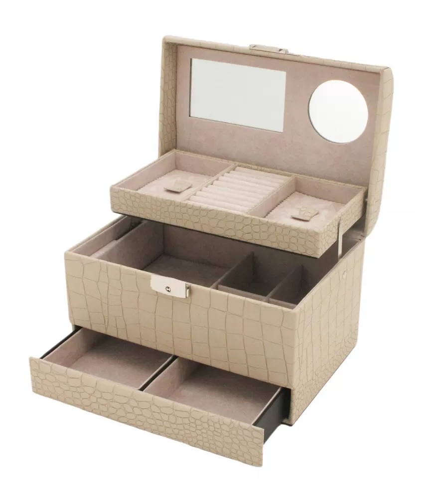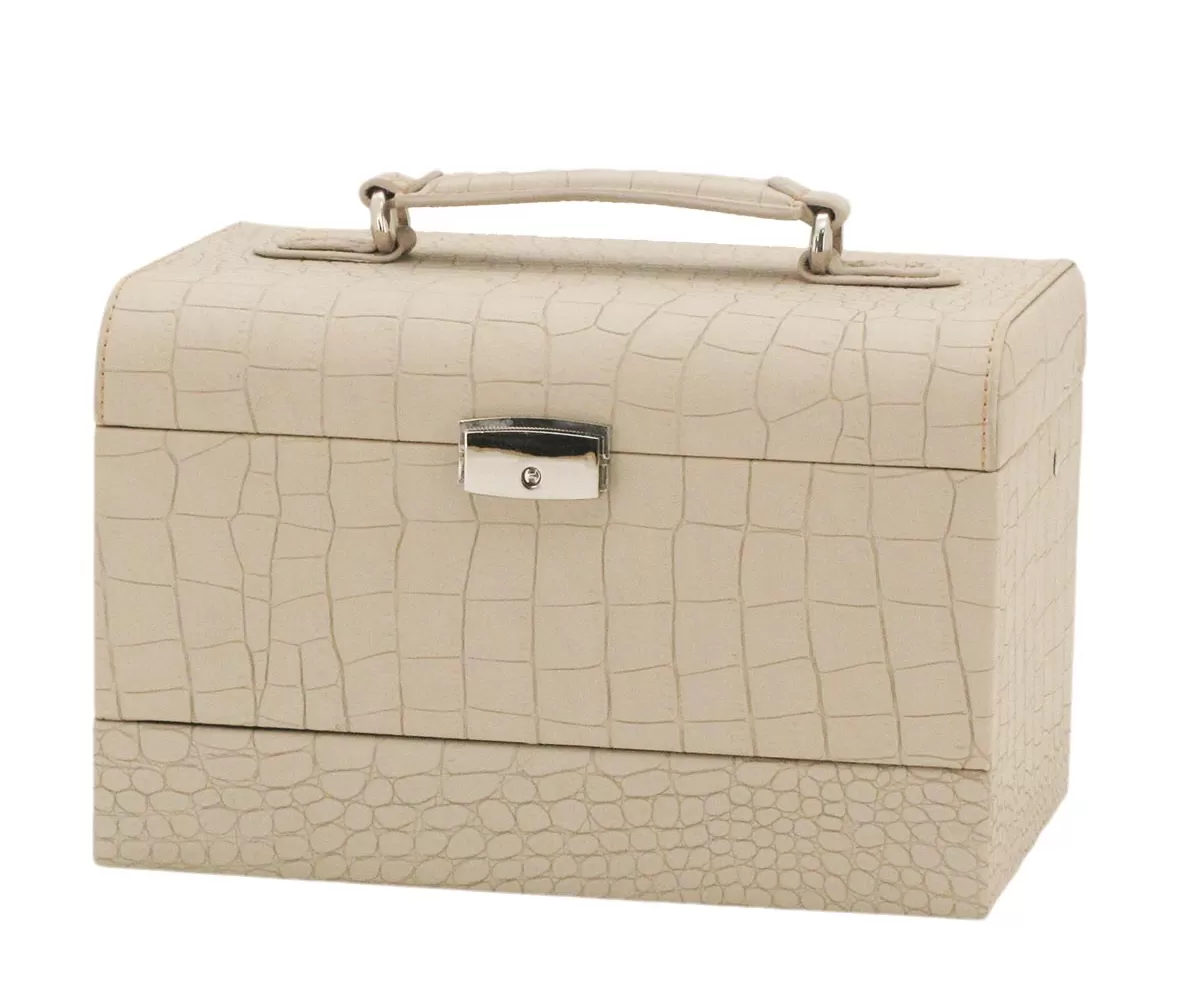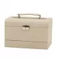 Perfektná šperkovnica v jemnej syntetickej koži v krémovej farbe uschová Vaše šperky v priestrannom úložnom priestore. Šperkovnica má tri poschodia na úschovu šperkov. Veko je doplnené úchytom pre ľahké prenášanie a šperkovnicu je možné uzamknúť. Vo veku sú navyše umiestnené dve praktické zrkadlá. Pri otvorení sa automaticky otvorí spodný šuplík a horné poschodie sa zdvihne.