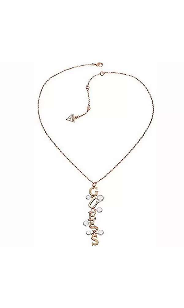 S týmto náhrdelníkom značky Guess budete neprehliadnuteľná a nie jedna žena Vám ho bude závidieť. Náhrdelník Guess je vyrobený z bižutérneho kovu vo farbe červeného zlata v lesklej povrchovej úprave. Náhrdelník sa skladá z jednoduchej retiazky, ktorú zdobí úchvatný prívesok v tvare nápisu Guess. Prívesok Guess je zdobený perlami a písmenko E je z časti vysadené žiarivými zirkónmi. Dĺžka tohto náhrdelníka Guess je 40cm, s využitím prídavnej retiazky v dĺžke 8 cm s logom Guess, je možné náhrdelník zapnúť až v dĺžke 48 cm.