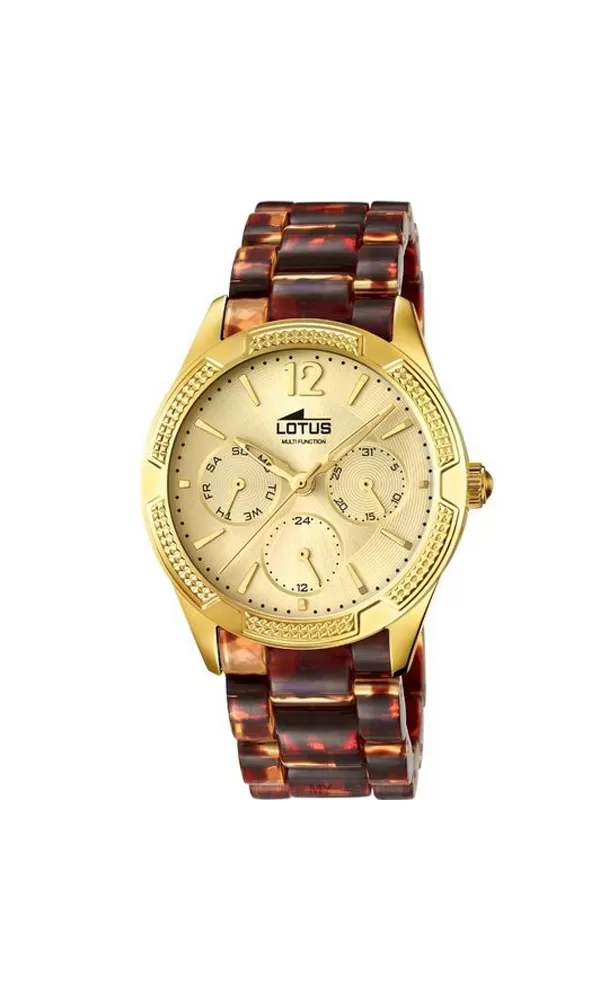 Remienok týchto hodiniek Lotus - L15927/2 je vyrobený z plastu. Plast vyniká svojou ľahkosťou, odolnosťou proti vode. Tiež je potrebné podotknúť, že je antialergický. Okrúhle púzdro je vyrobené zo pozlátenej ocele. Tesní do hĺbky 0,5 metrov.