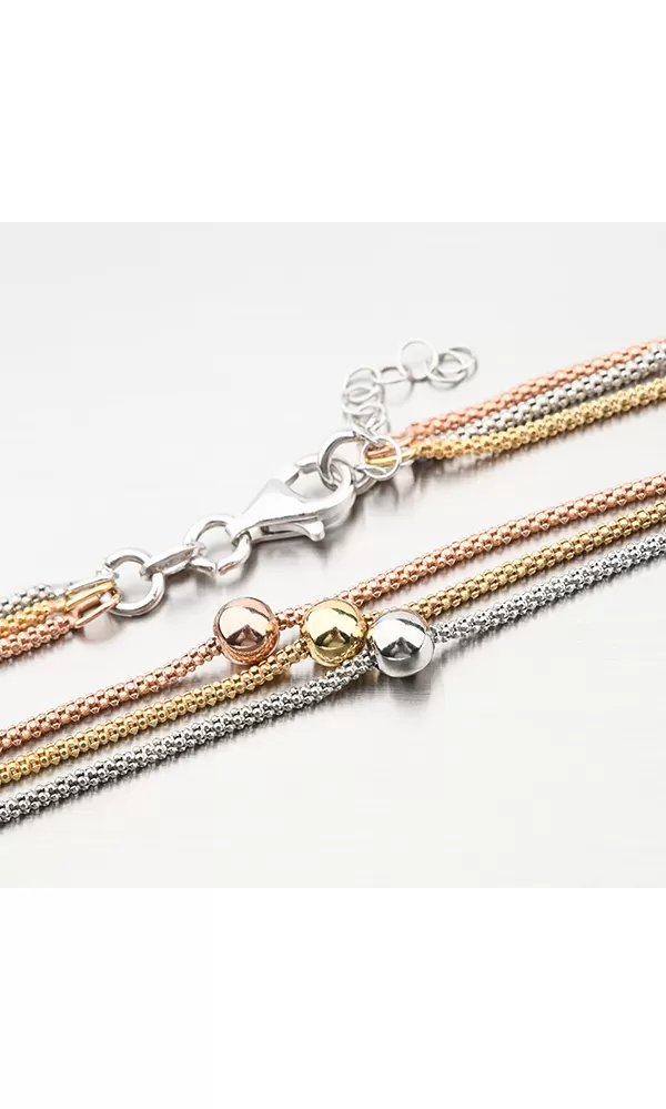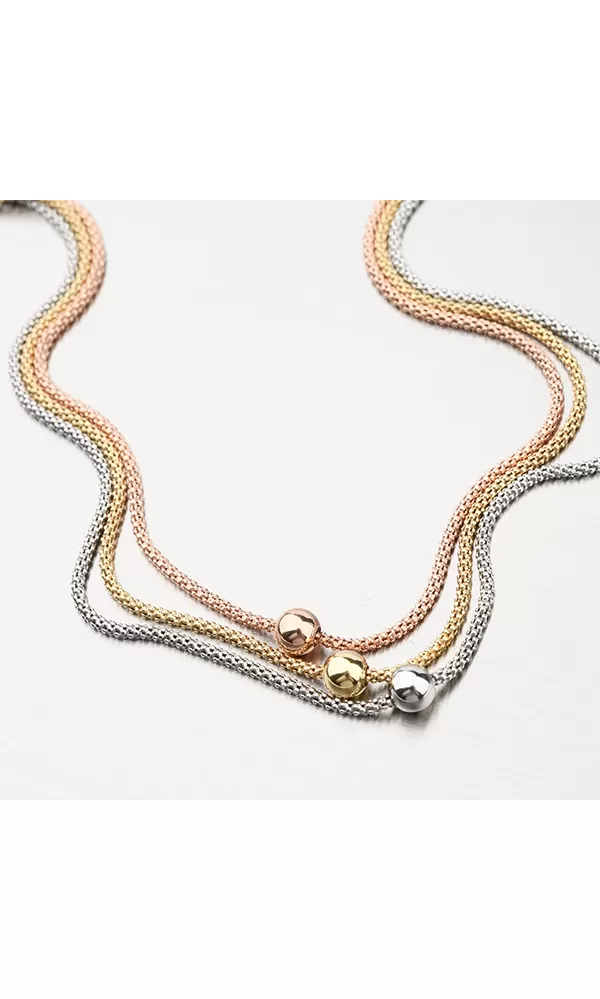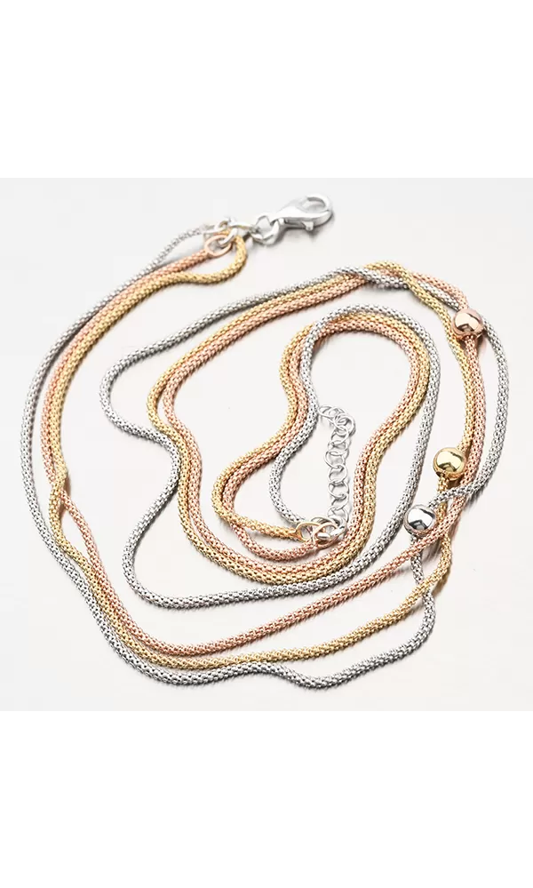 Tento náhrdelník z rhodiovaného striebra rýdzosti 925/1000 pozostáva z troch retiazok so striedajúcimi sa farbami. Jedna je strieborná, jedna ružová a jedna žltá. Táto elegantná retiazka nesmie chýbať v móde - zvláštnosťou je, že každá retiazka má inú dĺžku, na krku vyzerá úchvatne. Navyše ho zdobia lesklé pohyblivé guľôčky, ktoré perfektne sedia v strede retiazky.