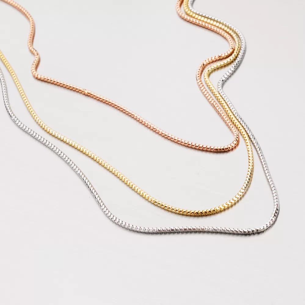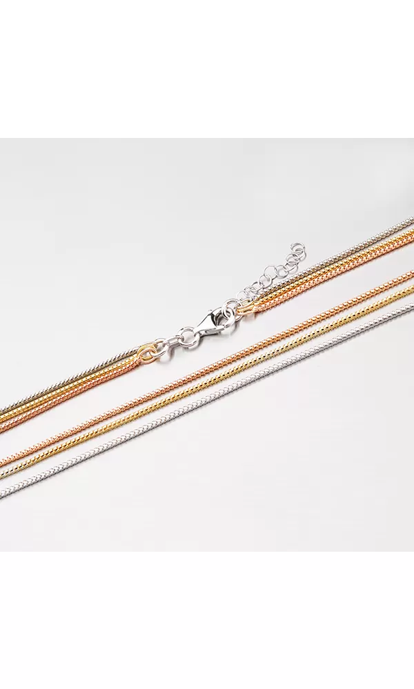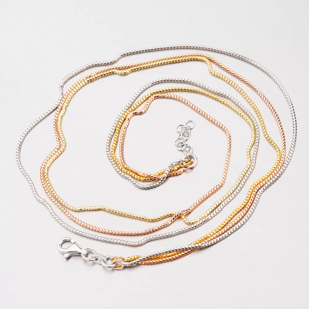 Tento rhodiovaný náhrdelník zo striebra o rýdzosti 925/1000 je vyrobený z troch častí a každá z nich je inak farebná. Najkratšia retiazka je ružová, prostredná je žltá a najdlhšia retiazka je striebornej farby. Táto elegantná retiazka je kúskom módy, ktorý určite musíte mať. Pre maximálny lesk a odolnosť je povrch striebra zušľachtený rhodiovaním. Ródium je ušľachtilý drahý kov zo skupiny platinových kovov. Rhodiovaním strieborných šperkov galvanickým nanášaním tohto drahého platinového kovu sa stáva povrch šperku tvrdší, stálejší a odolnejší voči vonkajším vplyvom ako je mechanický oter, poškriabanie, nabiehanie striebra, ľudský pot, kozmetické prípravky a ďalšie. Ródium je antialergické.