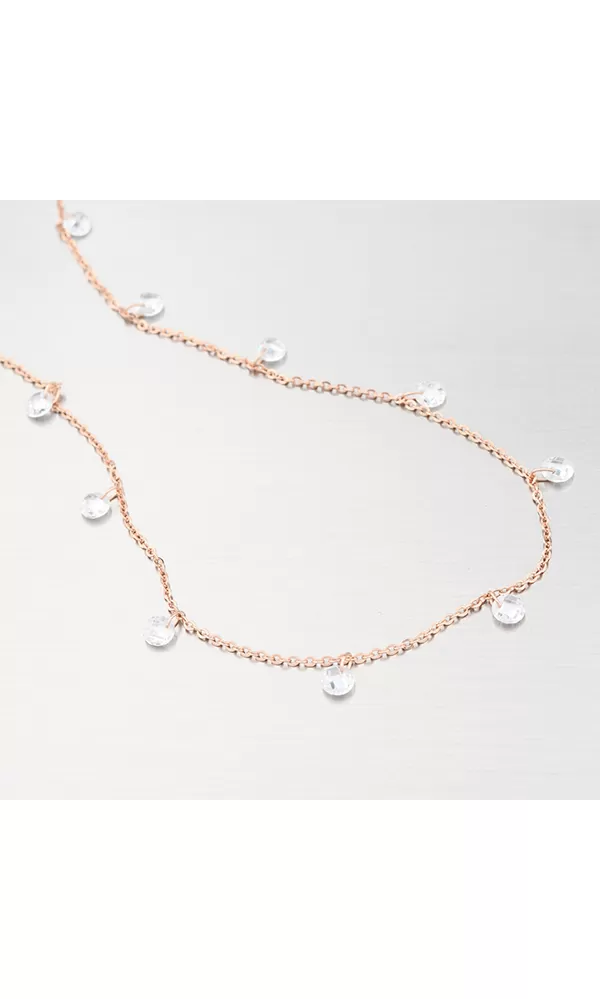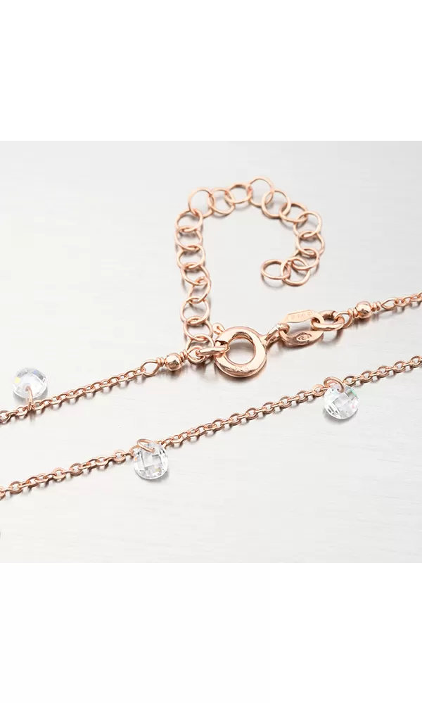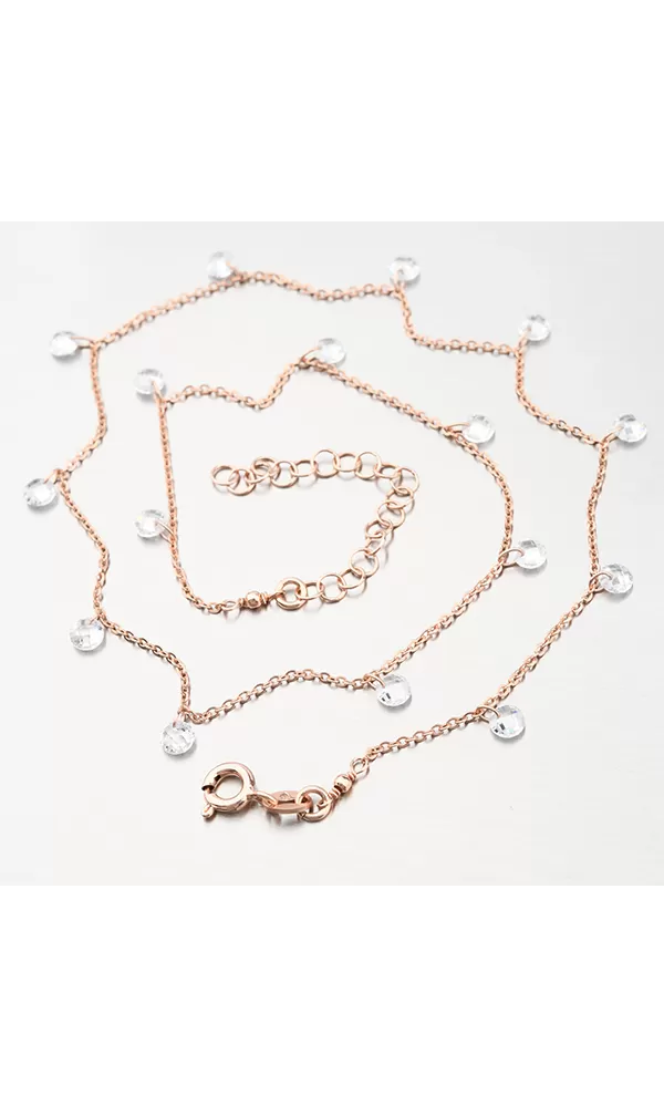 Tento náhrdelník s kryštálmi po celom obvode retiazky, ozdobí dekolt každej elegantnej žene či dievčaťu. Ružovú farbu zlata dodáva technika zlatenia PVD. Prednosťou zlatenia technológií PVD je vysoká tvrdosť a odolnosť proti oteru! Ide o hrubú vrstvu, ktorá preniká do pôvodného materiálu. Zlatenie technológií PVD sa dá porovnať s približne 12 mikrónmi galvanického zlatenia, čo je vysoká hodnota, ktorá pri bežnom nosení vydrží až 12 rokov.