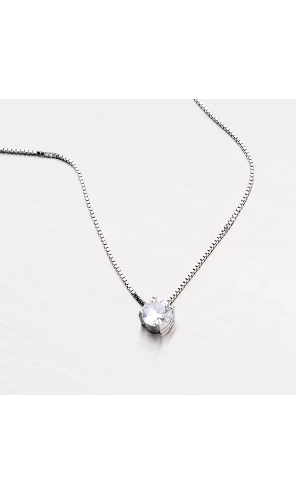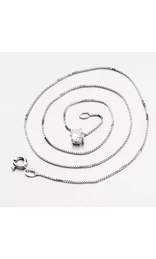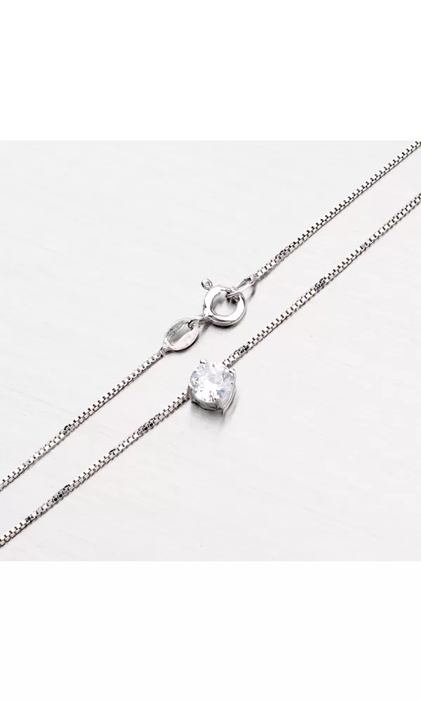 Jemný náhrdelník je zložený z retiazky Venezia a okrúhle prívesku s veľkým čírym zirkónom. Zirkón je brúsený do okrúhleho tvaru a bezpečne uchytený štyrmi krapnami. Takáto kombinácia pôsobí veľmi elegantne a sviežo. Náhrdelník sa zapína na perový krúžok.