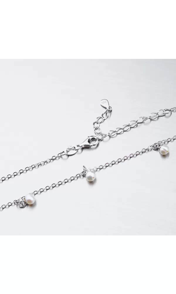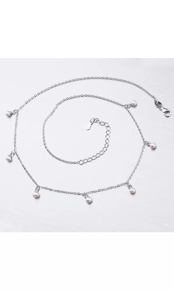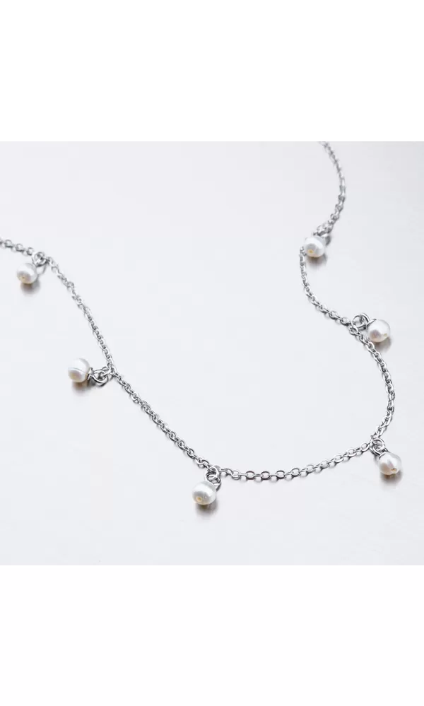 Jemný ale napriek tomu efektný náhrdelník je zdobený jemnými umelými perlami v bielej farbe, ktoré visí na retiazke. Náhrdelník sa zapína na karabínu.  Dĺžka náhrdelníka je 42 cm s použitím prídavnej retiazky je možné náhrdelník zapnúť kdekoľvek v rozmedzí 42 cm až 48 cm.