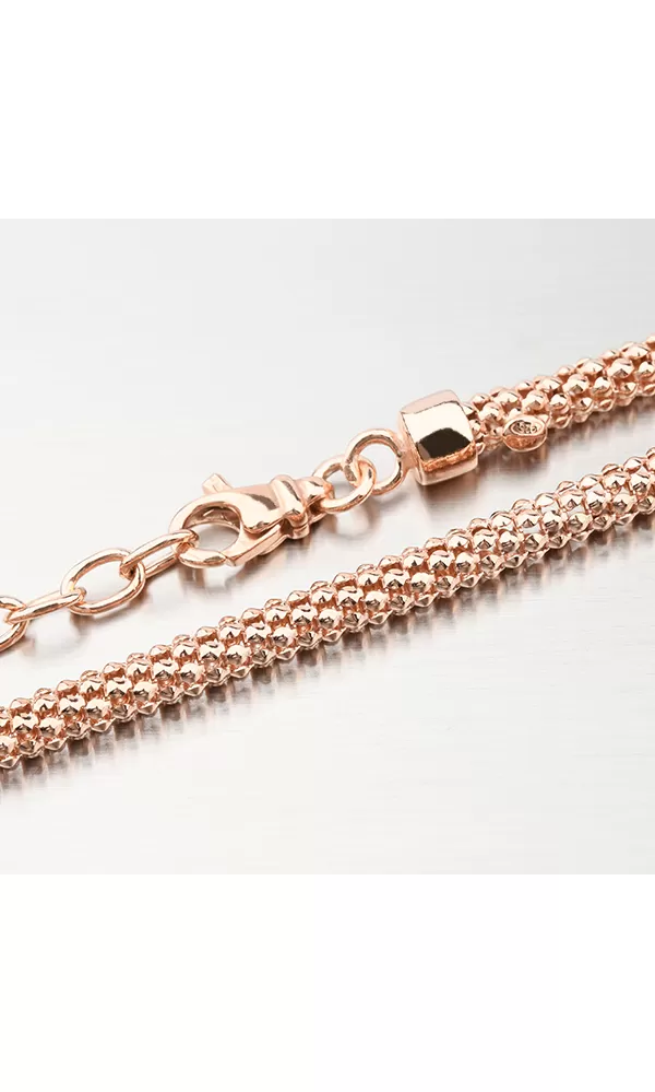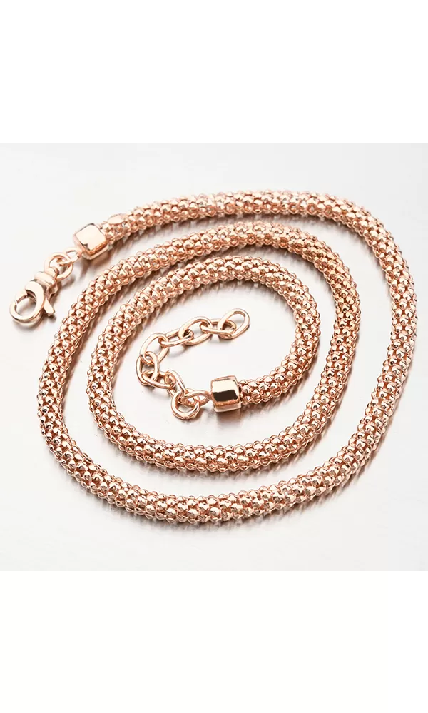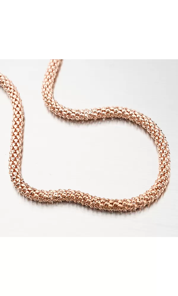 Žiarivý prepletený náhrdelník, ktorý sa bude na krku zaručene vynímať. Ružovú farbu zlata dodáva technika zlatenia PVD. Prednosťou zlatenia technológií PVD je vysoká tvrdosť a odolnosť proti oteru! Ide o hrubú vrstvu, ktorá preniká do pôvodného materiálu. Zlatenie technológií PVD sa dá porovnať s približne 12 mikrónmi galvanického zlatenia, čo je vysoká hodnota, ktorá pri bežnom nosení vydrží až 12 rokov.