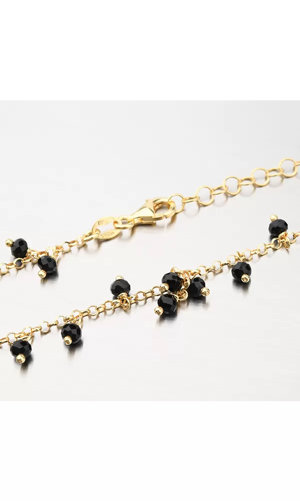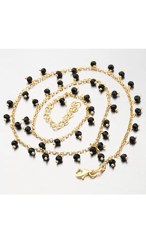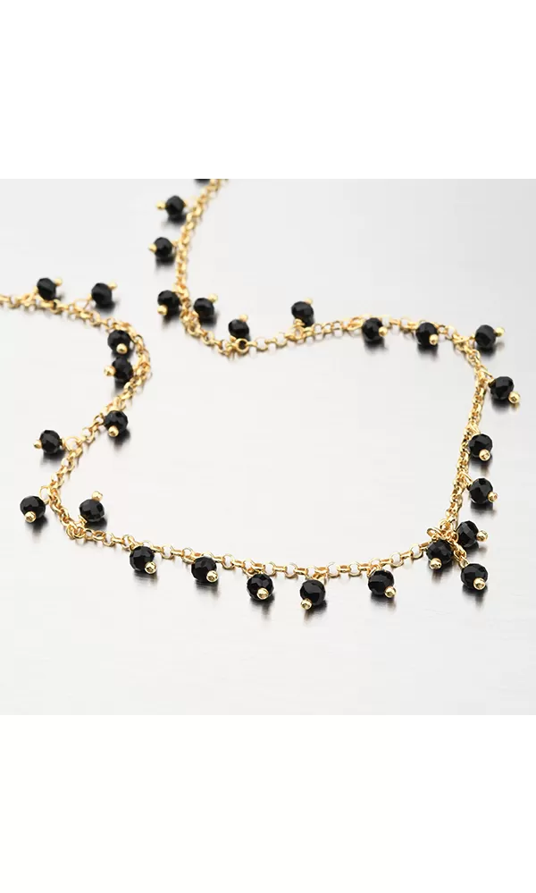 Elegantný náhrdelník s čiernymi kryštálmi. Žltú farbu zlata dodáva technika zlatenia PVD. Prednosťou zlatenia technológií PVD je vysoká tvrdosť a odolnosť proti oteru! Ide o hrubú vrstvu, ktorá preniká do pôvodného materiálu. Zlatenie technológií PVD sa dá porovnať s približne 12 mikrónmi galvanického zlatenia, čo je vysoká hodnota, ktorá pri bežnom nosení vydrží až 12 rokov.