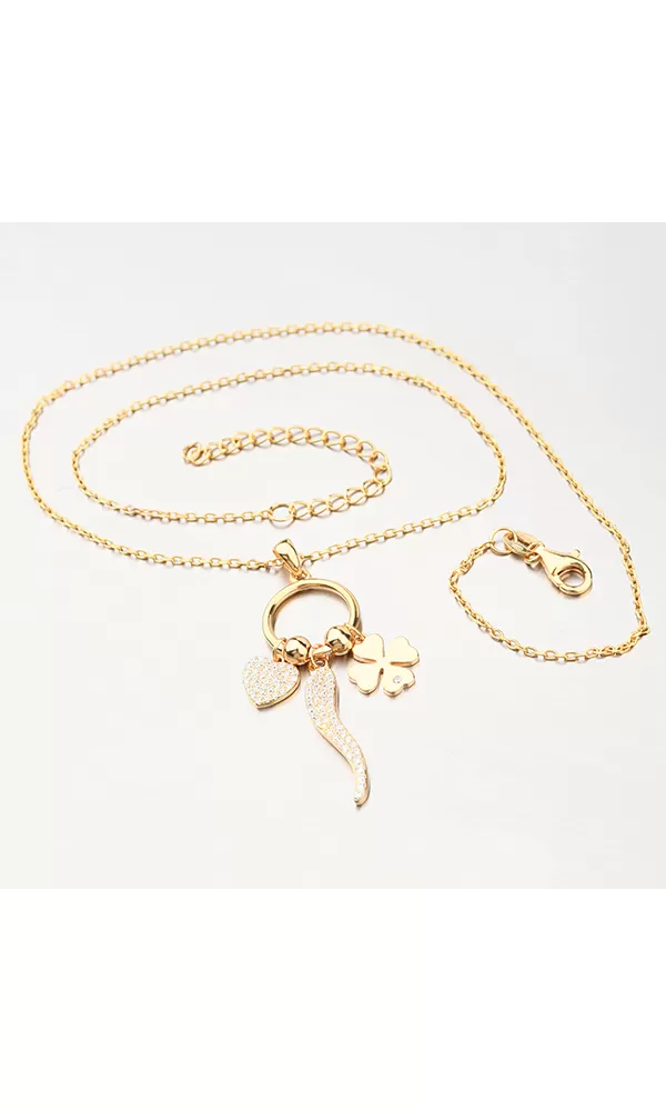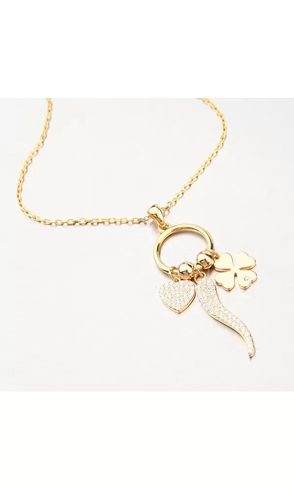 Náhrdelník s motívom srdca sa stane tým najosobnejším vyznaním, ktoré môže dievča či žena hrdo nosiť. Tento náhrdelník s retiazkou typu Anker tvorený facetami je ozdobený vo svojom strede kolieskom, ktoré obsahuje viac príveskov. A to srdce osadené zirkónmi, štvorlístok s jedným zirkónom a krídlo kompletne osadené zirkónmi. Facety na retiazke sú zhotovené diamantovým nástrojom, ktorý dodáva vzniknutým facetám maximálny lesk, vďaka ktorému dokonale odráža svetlo a majú krásnu brilanciu zo všetkých uhlov pohľadu!