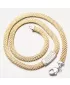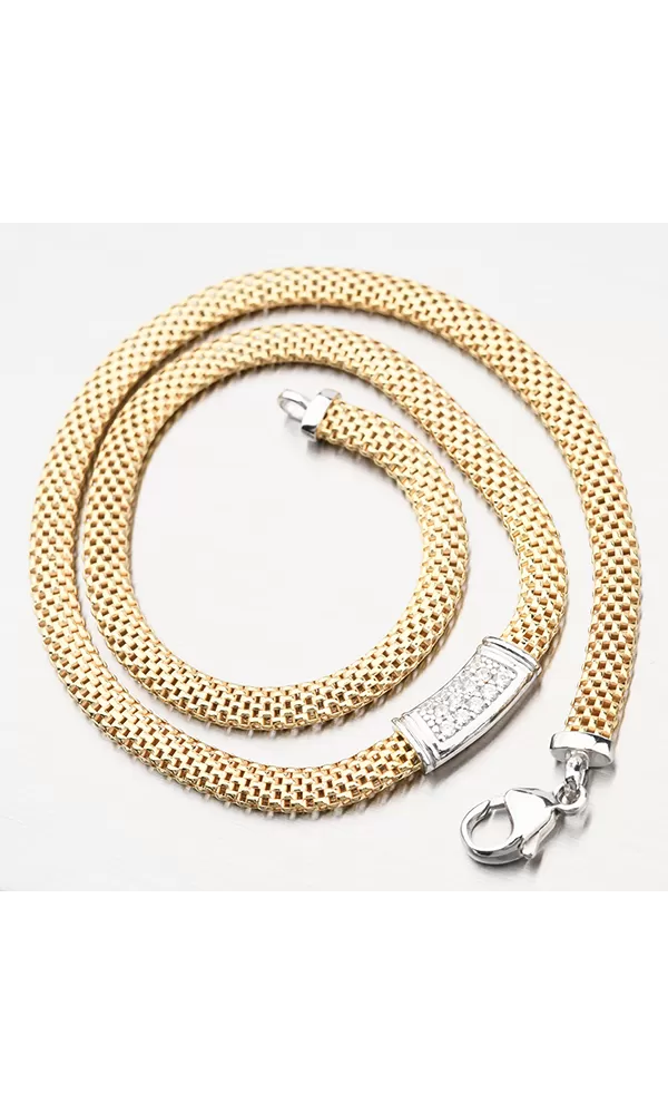 Prepracovaný náhrdelník, ktorý je tvorený z prepletenej retiazky. V strede náhrdelníka je časť osadená žiarivými zirkónmi v briliantovom bruse a to v troch radoch. Náhrdelník vyzerá na prvý pohľad luxusne. Žltú farbu zlata dodáva technika zlatenia PVD. Prednosťou zlatenia technológií PVD je vysoká tvrdosť a odolnosť proti oteru! Ide o hrubú vrstvu, ktorá preniká do pôvodného materiálu. Zlatenie technológií PVD sa dá porovnať s približne 12 mikrónmi galvanického zlatenia, čo je vysoká hodnota, ktorá pri bežnom nosení vydrží až 12 rokov.