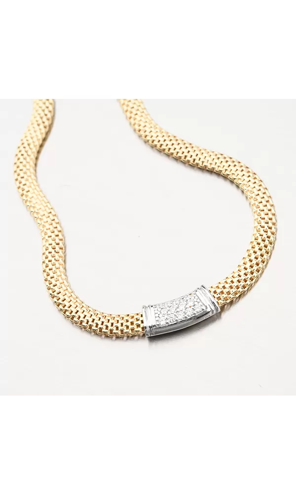 Prepracovaný náhrdelník, ktorý je tvorený z prepletenej retiazky. V strede náhrdelníka je časť osadená žiarivými zirkónmi v briliantovom bruse a to v… Celý popis