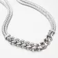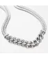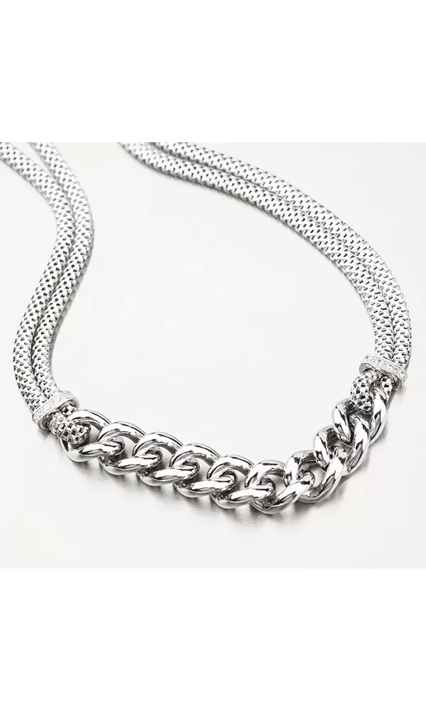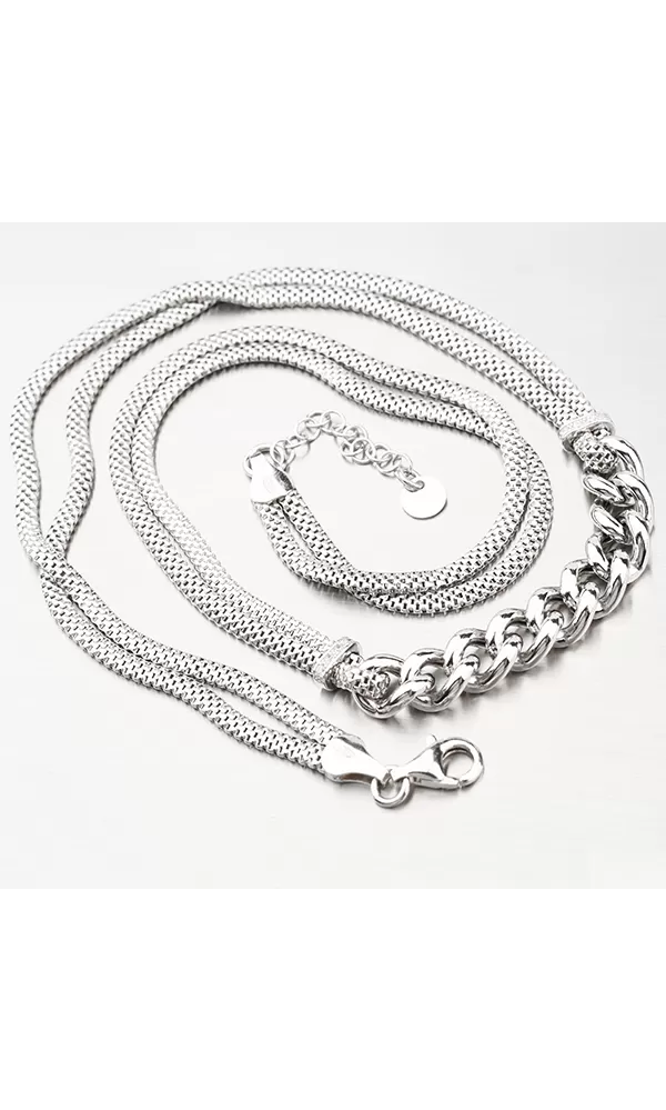 Prepracovaný náhrdelník, ktorý je tvorený z dvoch retiazok pleteného tvaru. V strede náhrdelníka je časť tvorená veľkými očkami. Náhrdelník vyzerá na prvý pohľad luxusne.