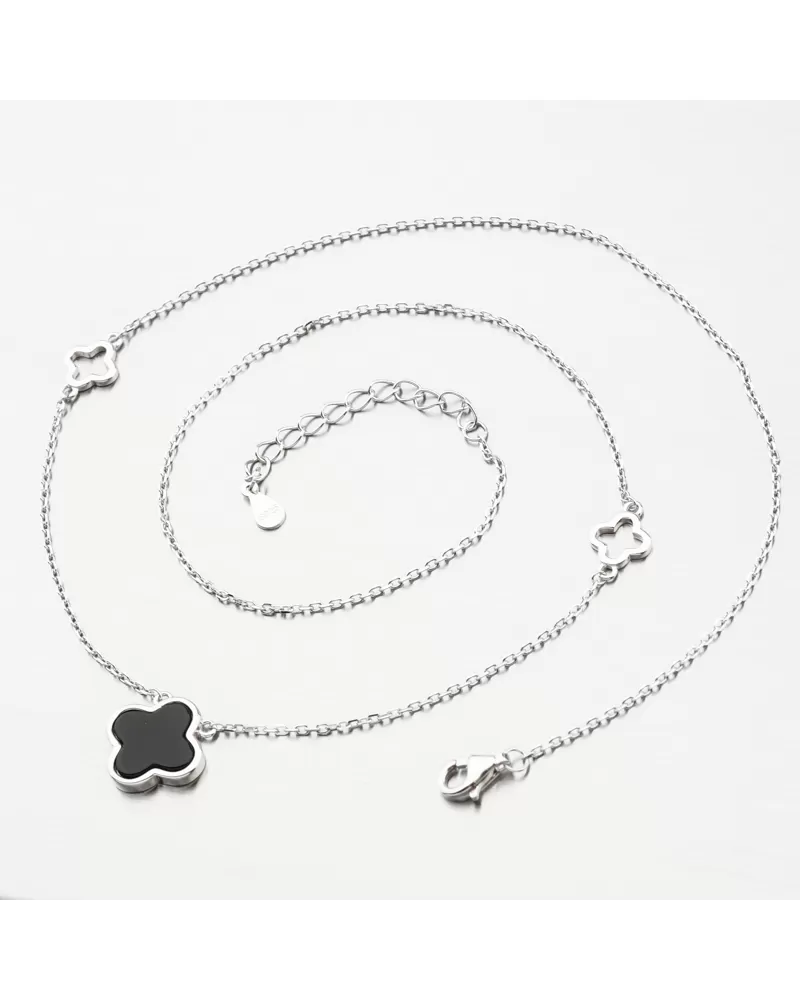 Slušivý strieborný náhrdelník pre ženy alebo dievčatá, ktoré majú rady jemné a elegantné šperky. Retiazka je typu anker a zdobia ho ozdoby v tvare štvorlístka. Hlavný štvorlístok v strede náhrdelníka je osadený čiernym stredom. Potom na každej strane nájdete obrys štvorlístka v jednoduchom a lesklom prevedení.