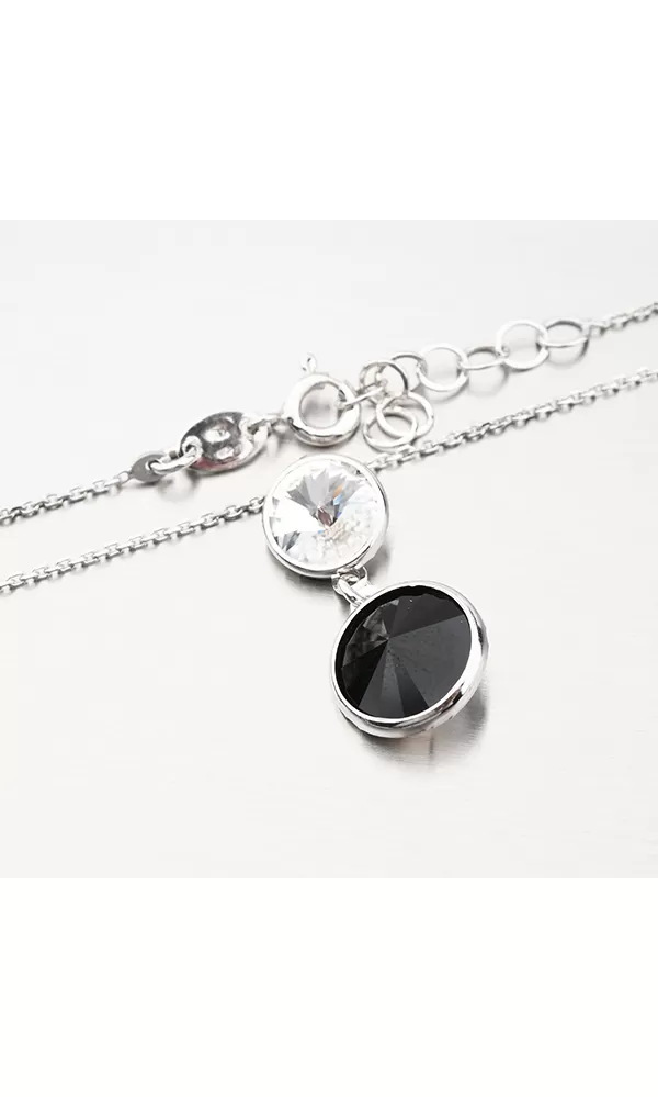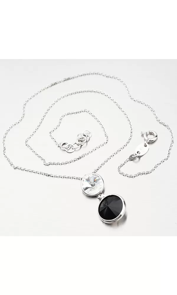 Tento náhrdelník s reťazou typu súhlasu as kryštálmi ozdobí dekolt akejkoľvek elegantnej žene alebo dievčaťu. Na reťazci sú dva kryštály, jeden menší v bielej a pod ňou v čiernej farbe. Reťaz je zdobená aspektmi, ktoré sú vyrobené pomocou diamantového nástroja. Poskytuje výsledným aspektom maximálny lesk, vďaka čomu dokonale odráža svetlo a má krásnu brilanciu zo všetkých uhlov!