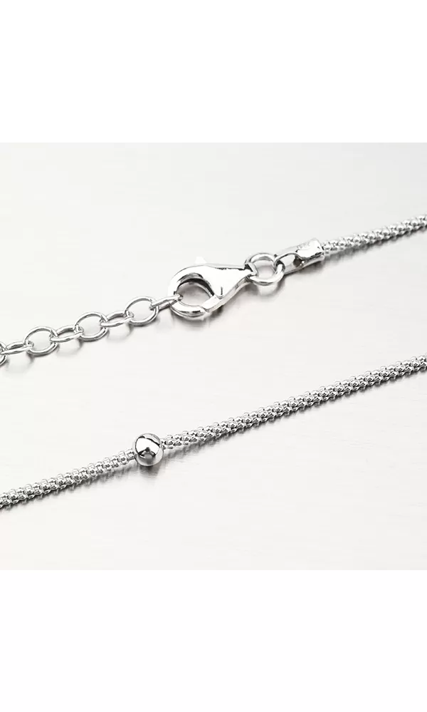 Náhrdelník je vyrobený zo striebra rýdzosti 925/1000 v lesklej povrchovej úprave s rhodiovaním. Ródium je ušľachtilý drahý kov zo skupiny platinových kovov. Rhodiovaním strieborných šperkov galvanickým nanášaním tohto drahého kovu sa povrch šperku stáva tvrdším, trvácnejším a odolnejším voči vonkajším vplyvom ako sú mechanické otery, poškriabanie, zatekanie striebra, ľudský pot, kozmetické prípravky a iné. Rhodium je antialergické.