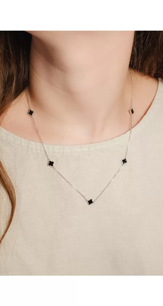 Retiazka, ktorá očarí hneď na prvý pohľad. Náhrdelníky so štvorlístkom sú obľúbeným symbolom šťastia, nádeje a pozitívnej energie. Retiazka je typu anker a zdobia ho ozdoby v tvare štvorlístka v čiernej farbe. Farba je vidieť z oboch strán, nezáleží teda ako si náhrdelník zapnete alebo keď by sa pretočil.