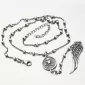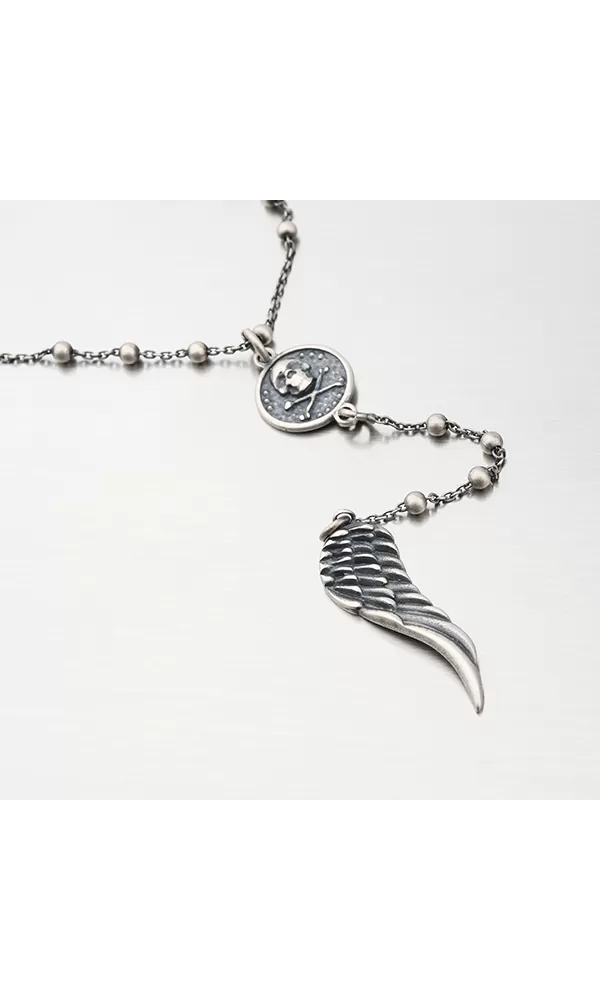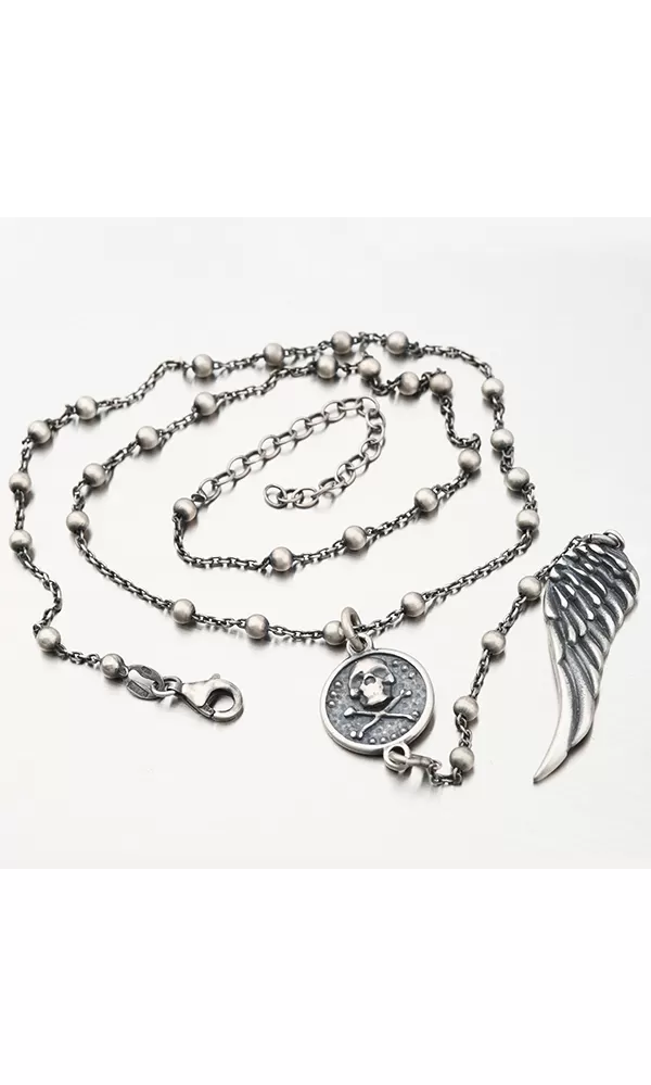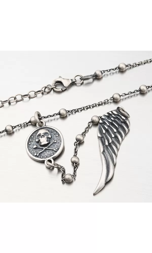 Unikátny náhrdelník dekorovaný guličkami, retiazka vo svojom strede spája prívesok s lebkou a prekríženými kosťami, potom vedie retiazka dole a na jej konci sa nachádza prívesok s krídlom. Tento náhrdelník si zamilujete, navyše má špecifickú šedú farbu, ktorá dodáva náhrdelníku ten správny šmrnc.