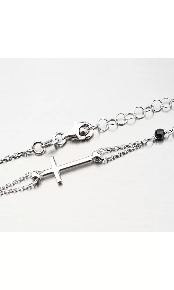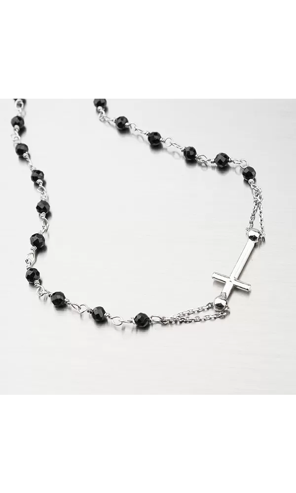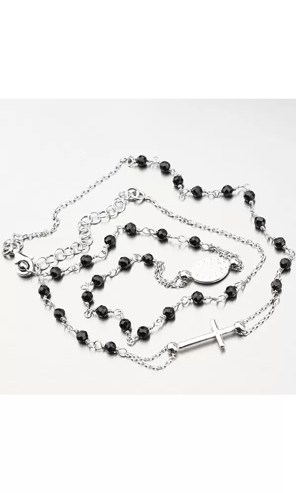 Symbolický náhrdelník dekorovaný čiernymi kryštálmi a potom s príveskom s vyobrazenou postavou Madonky as príveskom krížika. Dĺžka náhrdelníka je 46 cm, s využitím retiazky 4 cm, je možné náhrdelník zapnúť v dĺžke 46 až 50 cm. Nastaviteľná dĺžka má úžasnú výhodu v tom, že nemusíte poznať presnú dĺžku retiazky a darovaná osoba si dĺžku sama upraví podľa vlastných preferencií.