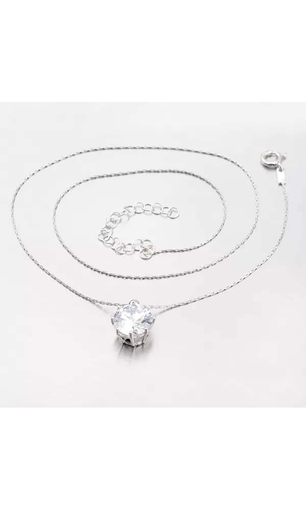 Tento krásny náhrdelník je vyrobený zo striebra o rýdzosti 925/1000 s lesklou povrchovou úpravou. Na retiazke nájdete krásny prívesok s veľkým zirkónom v briliantovom bruse, ktorý zaručuje maximálny lesk a brilanciu kameňa. Náhrdelník môžete zapnúť na dĺžku 40 cm a vďaka pridanej retiazke až na dĺžku 45 cm. Povrch šperku je zušľachtený rhodiovaním. Ródium je ušľachtilý drahý kov zo skupiny platinových kovov. Rhodiovaním strieborných šperkov galvanickým nanášaním tohto drahého platinového kovu sa stáva povrch šperku tvrdší, stálejší a odolnejší voči vonkajším vplyvom ako je mechanický oter, poškriabanie, nabiehanie striebra, ľudský pot, kozmetické prípravky a ďalšie. Ródium je antialergické.
