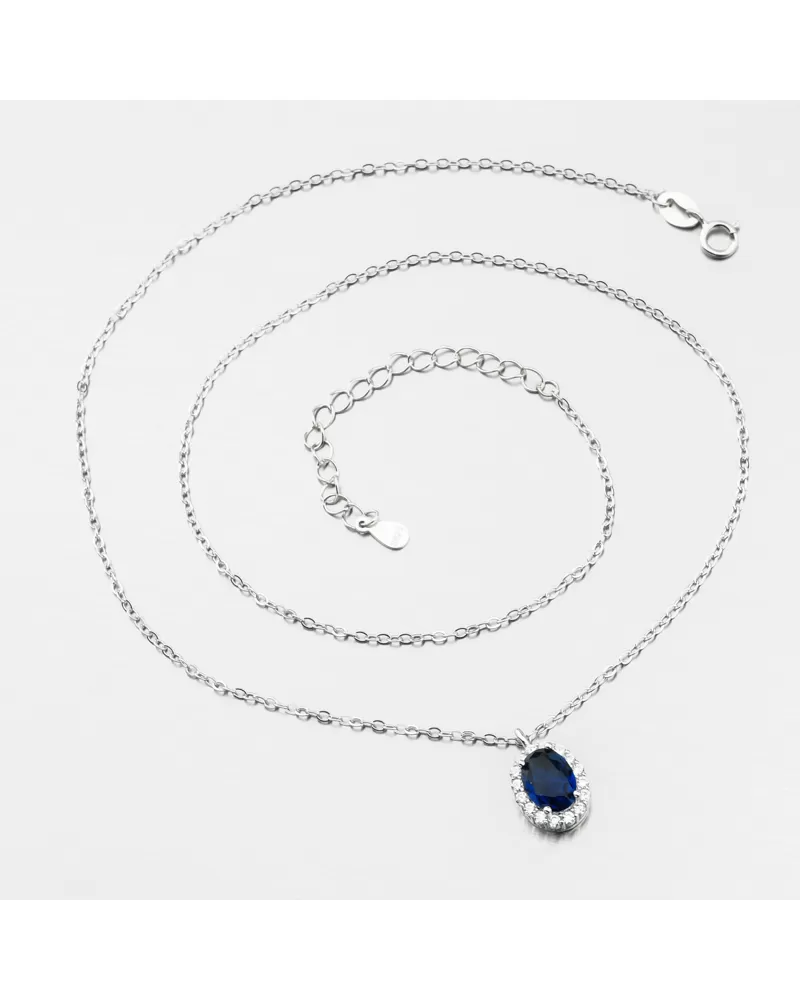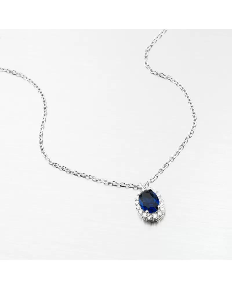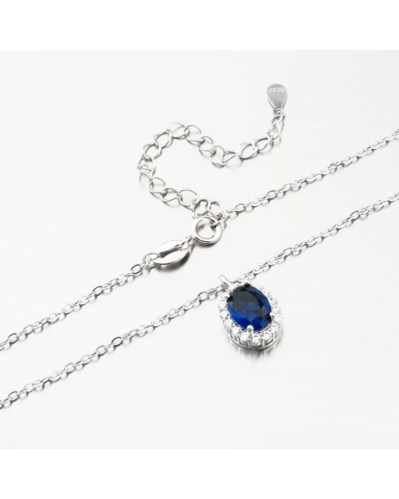 Buďte neprehliadnuteľná s týmto náhrdelníkom, ktorý zdobí prívesok oválneho tvaru. Dominantou prívesku je modrý syntetický zafír v nádhernej modrej farbe. Okolo zafíru sú po celom obvode vsadené žiarivé zirkóny. Zirkóny sú briliantového brusu, ktorý im dodáva dokonalú brilanciu, skvele odráža svetlo a krásne žiari z každého uhla pohľadu.