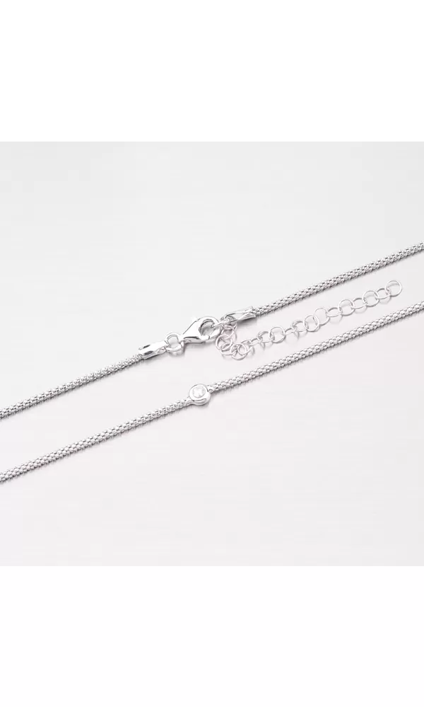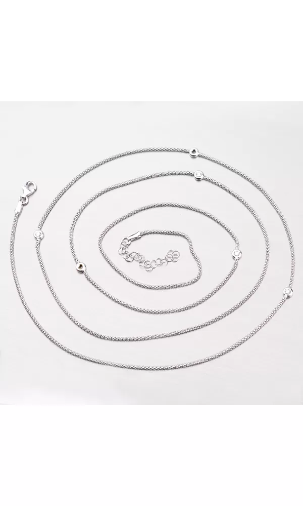 Krásny jednoduchý náhrdelník zdobený okrúhlymi puzdrami so zirkónmi si obľúbite pre svoju jednoduchosť a eleganciu. Náhrdelník je vyrobený zo striebra o rýdzosti 925/1000 a je zdobený gravírovanými facetami robenými za pomoci nástroja s diamantovou hlavou, ktoré dodávajú celému šperku maximálny lesk a brilanciu zo všetkých uhlov. Náhrdelník má pletenú okrúhlu retiazku s priemerom 1,50 mm. Povrch náhrdelníka je zušľachtený rhodiovaním. Ródium je ušľachtilý drahý kov zo skupiny platinových kovov. Rhodiovaním strieborných šperkov galvanickým nanášaním tohto drahého platinového kovu sa stáva povrch šperku tvrdší, stálejší a odolnejší voči vonkajším vplyvom ako je mechanický oter, poškriabanie, nabiehanie striebra, ľudský pot, kozmetické prípravky a ďalšie. Ródium je antialergické.