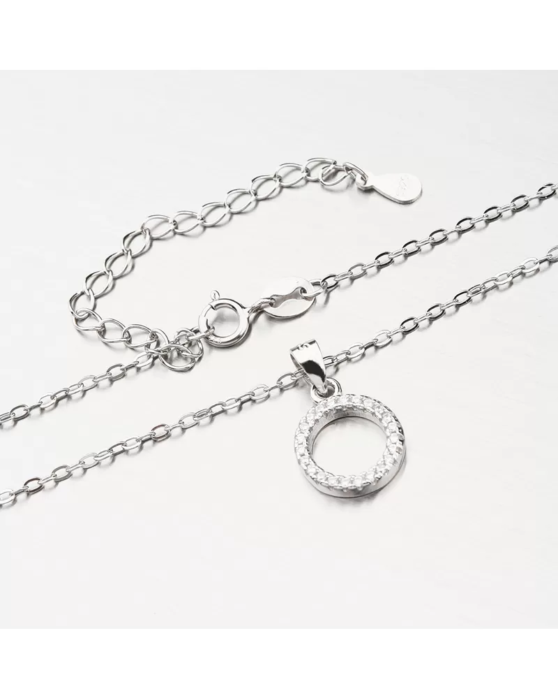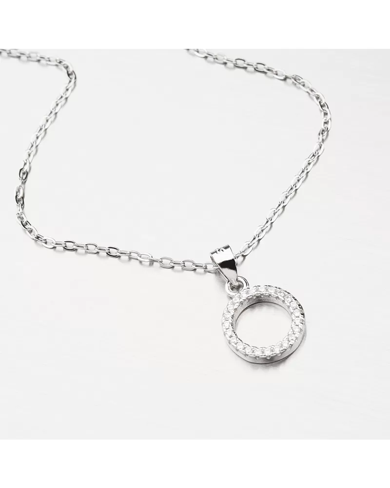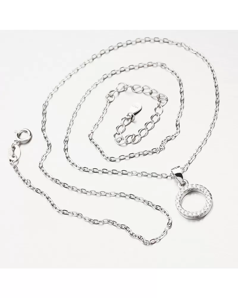 Náhrdelník zdobí elegantný kruh, ktorý je vysadený žiarivými zirkónmi. Zirkóny sú precízne vsadené jeden vedľa druhého a brúsené do briliantového brusu. Dĺžka náhrdelníka je 42 cm, s využitím prídavnej retiazky s dĺžkou 5 cm, je možné náhrdelník zapnúť až na dĺžku 47 cm.