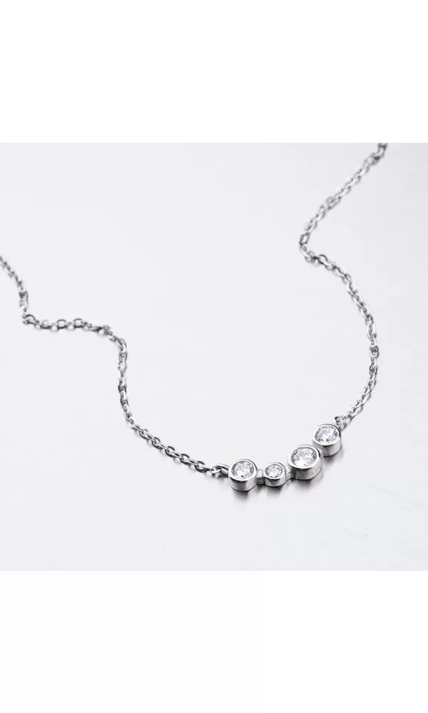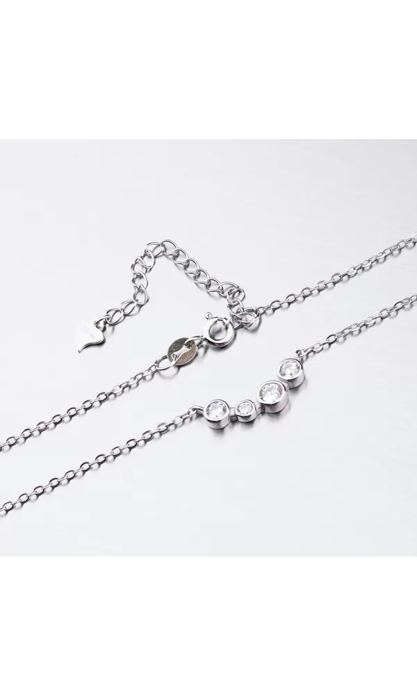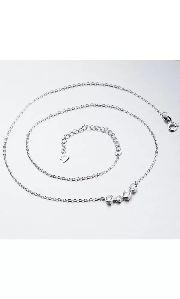 Nechajte vyniknúť svoj dekolt vďaka tomuto striebornému náhrdelníku. Náhrdelník zdobia zirkóny v brilantovom bruse, ktoré sú vsadené do krúžkov. Náhrdelník sa zapína na perový krúžok. Dĺžka náhrdelníka je 42 cm s použitím prídavnej retiazky je možné náhrdelník zapnúť kdekoľvek v rozmedzí 42 cm až 48 cm.