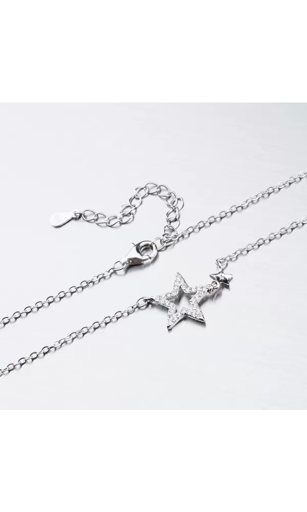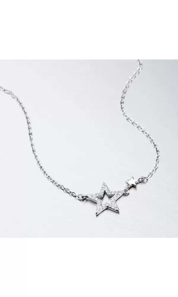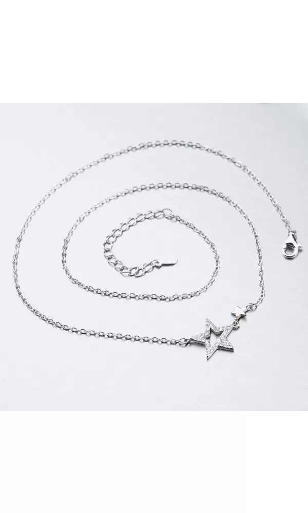 Krásny náhrdelník zdobí prívesok v tvare hviezdy, ktorá je vysadená zirkónmi v briliantovom bruse. Hneď vedľa veľkej hviezdy je aj malá hviezdička v lesklej povrchovej úprave. Náhrdelník sa zapína na karabínu. Dĺžka náhrdelníka je 42 cm s použitím prídavnej retiazky je možné náhrdelník zapnúť kdekoľvek v rozmedzí 42 cm až 48 cm.