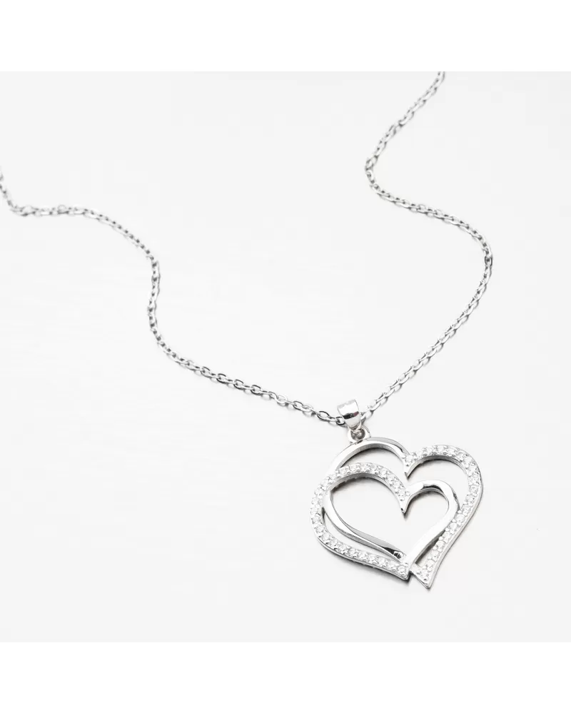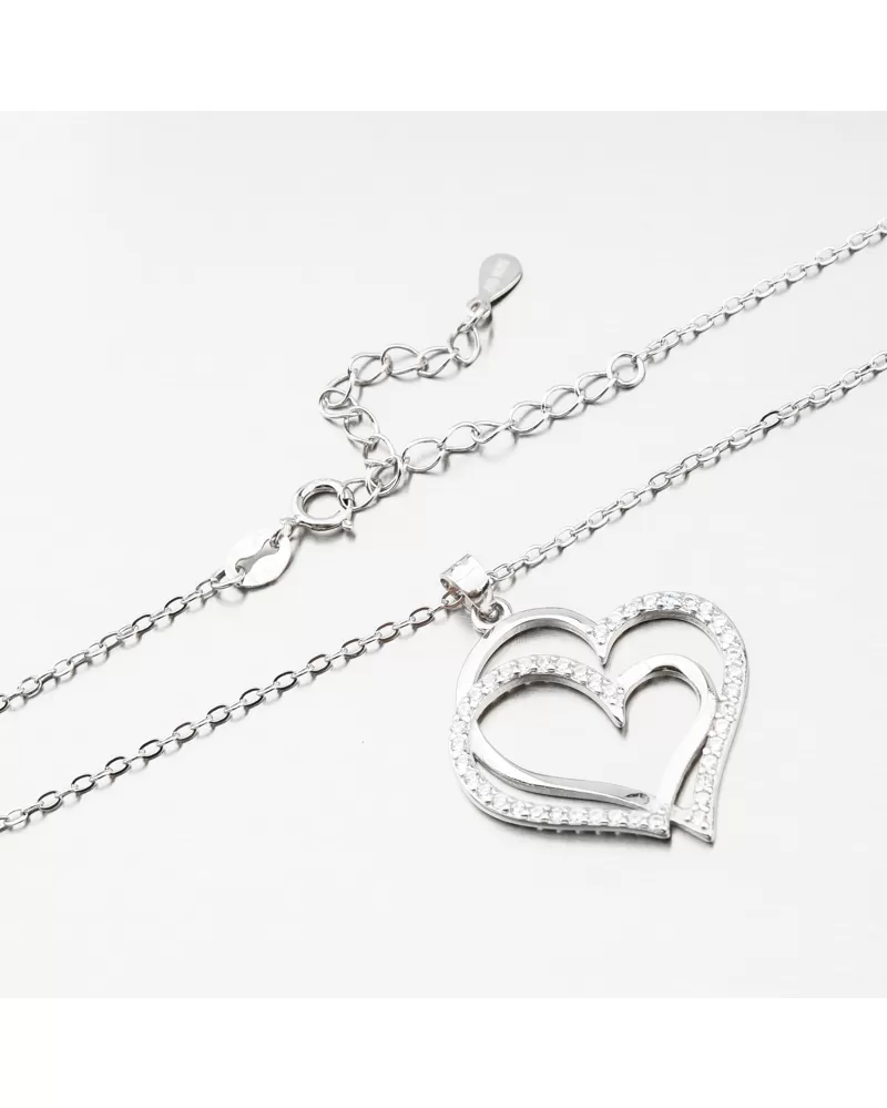 Strieborný náhrdelník je ozdobený príveskom, ktorý tvorí dve prepletené srdcia a obe srdcia majú jednu polovicu osadenú trblietavými zirkónmi. Zirkóny sú briliantového brusu, ktorý im dodáva dokonalú brilanciu, skvele odráža svetlo a krásne žiari z každého uhla pohľadu.