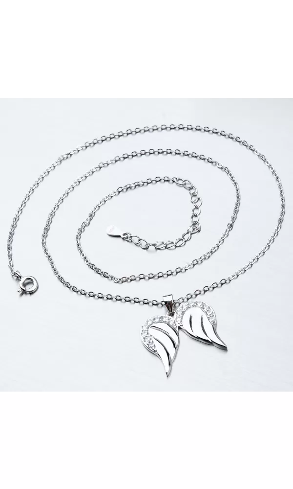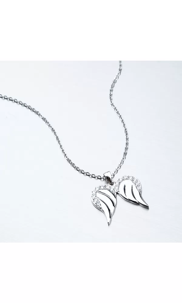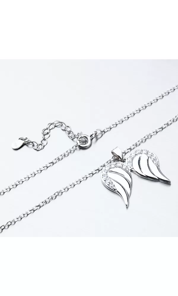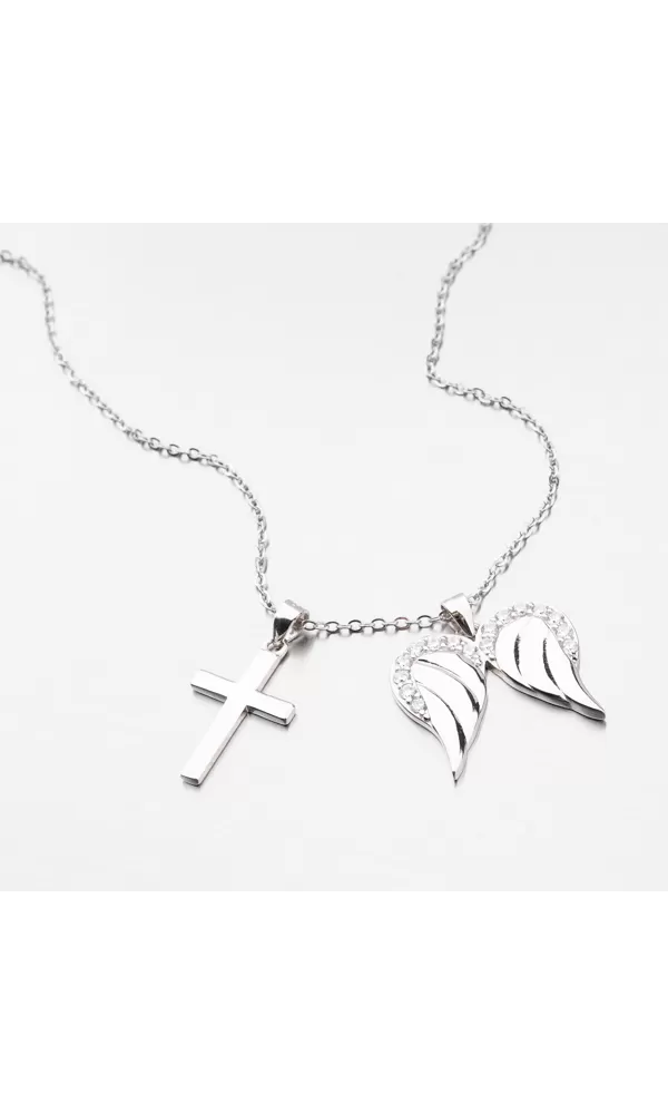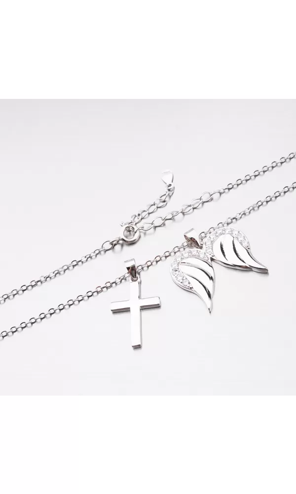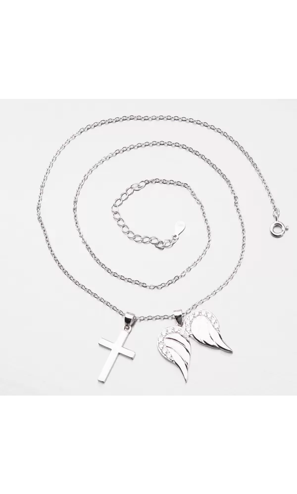 Luxusný náhrdelník je tvorený retiazkou anker a k dispozícii má dva prívesky . Ktorú si na retiazku navlečiete je len na vás. Oba prívesky môžete nosiť súčasne alebo ich môžete použiť samostatne - anjelské krídla zdobené zirkónmi alebo jednoduchý kríž v lesklej povrchovej úprave. Náhrdelník sa zapína na perový krúžok. Dĺžka náhrdelníka je 42 cm s použitím prídavnej retiazky je možné náhrdelník zapnúť kdekoľvek v rozmedzí 42 cm až 45 cm.