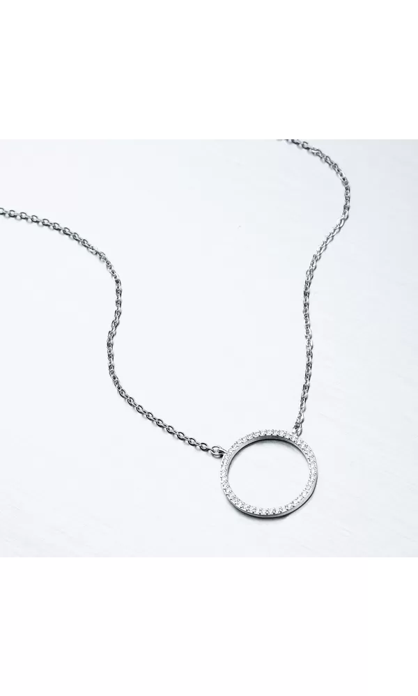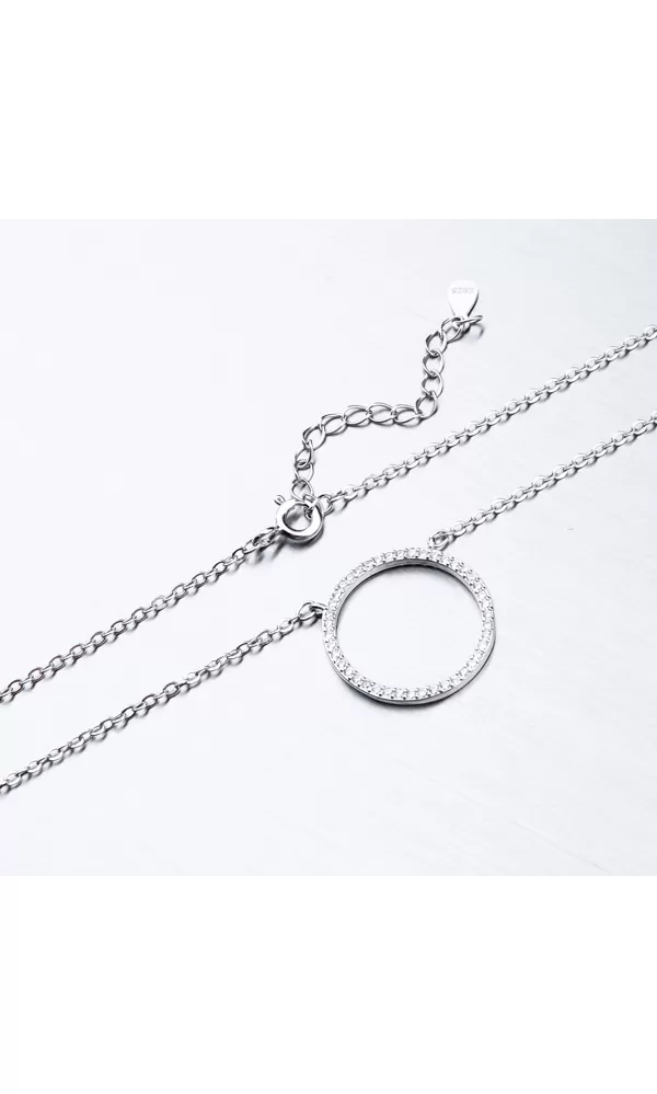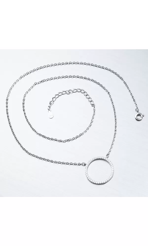 Elegantný náhrdelník je tvorený retiazkou anker a príveskom, ktorý je na pevno pripevnený. Prívesok je tvaru kruhu a zdobia ho zirkónmi v briliantovom bruse. Náhrdelník sa zapína na perový krúžok. Dĺžka náhrdelníka je 42 cm s použitím prídavnej retiazky je možné náhrdelník zapnúť kdekoľvek v rozmedzí 42 cm až 45 cm.