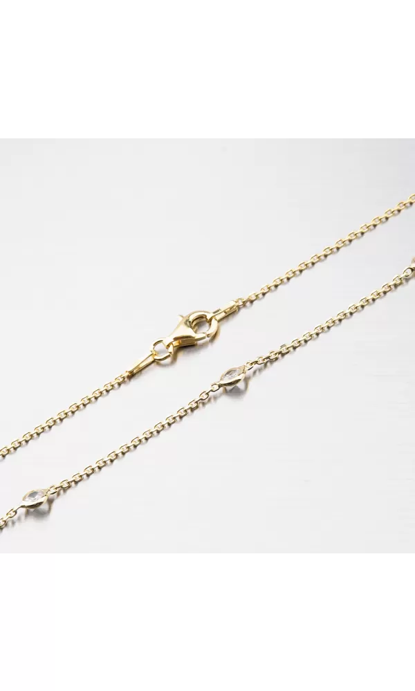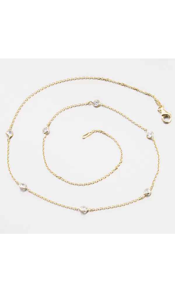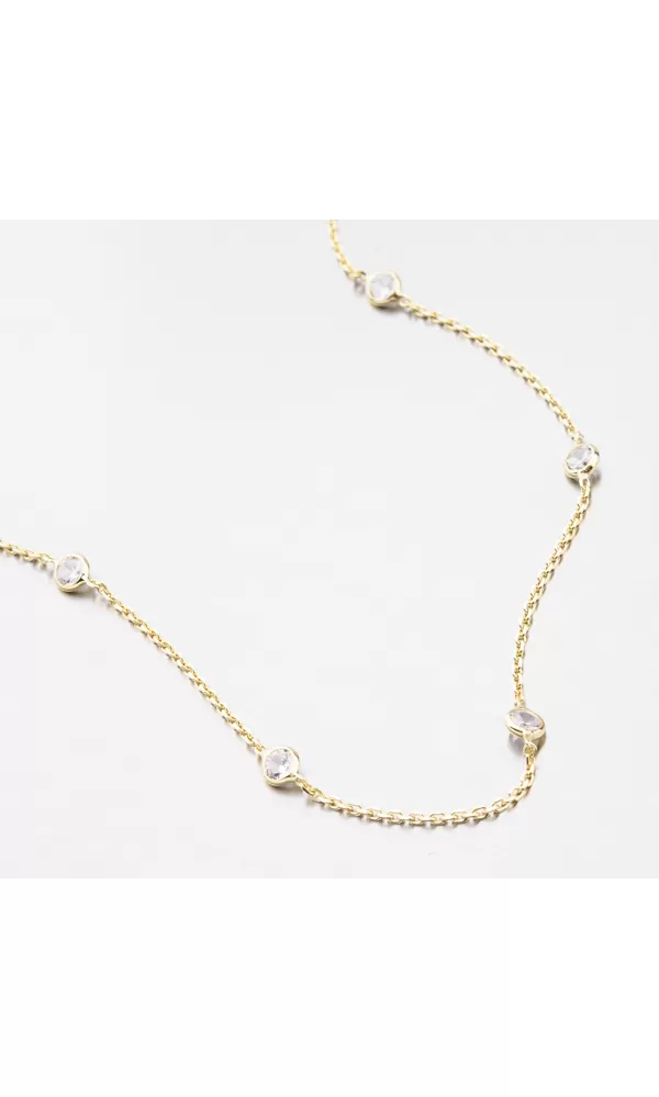 Ozdobte sa jemným náhrdelníkom, ktorý je ozdobený elegantnými zirkónmi v briliantovom bruse. Náhrdelník zdobí šesť zirkónov, ktoré sú od seba rovnako ďaleko. Zapína sa na karabínu.