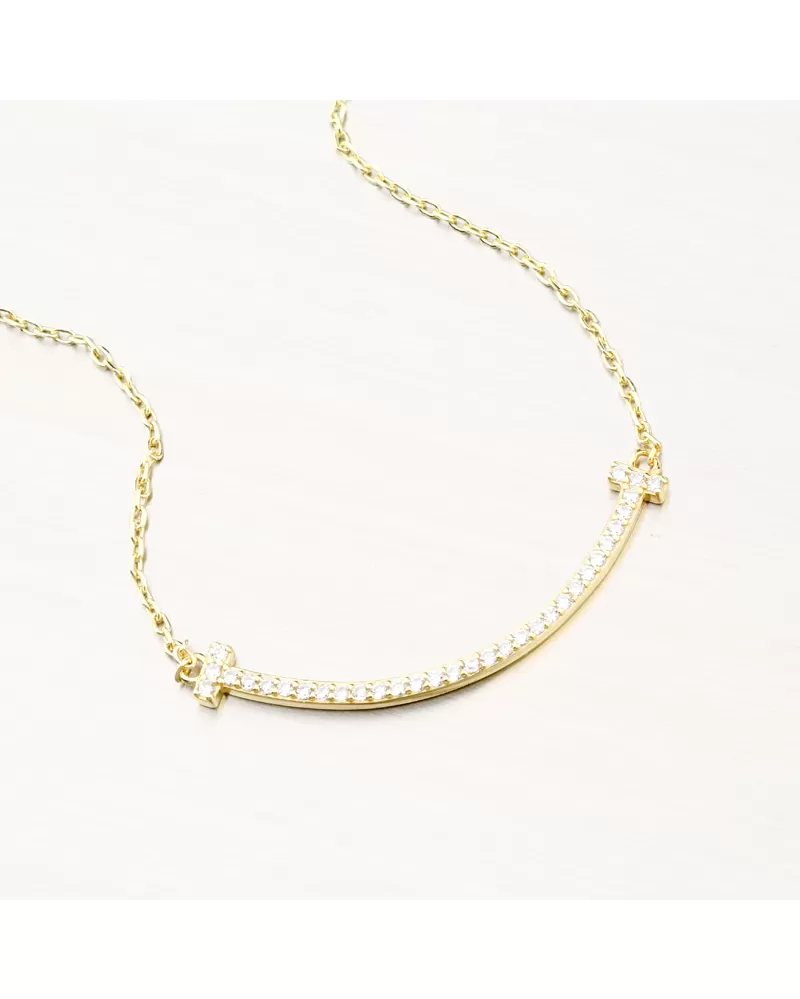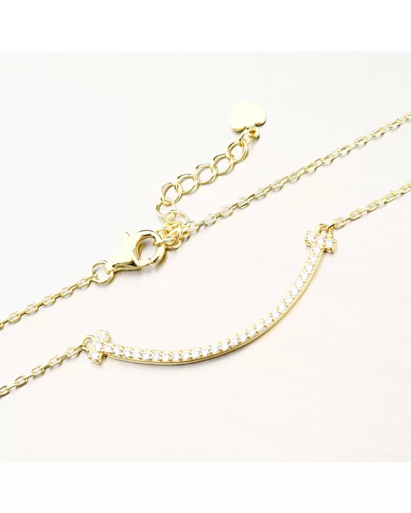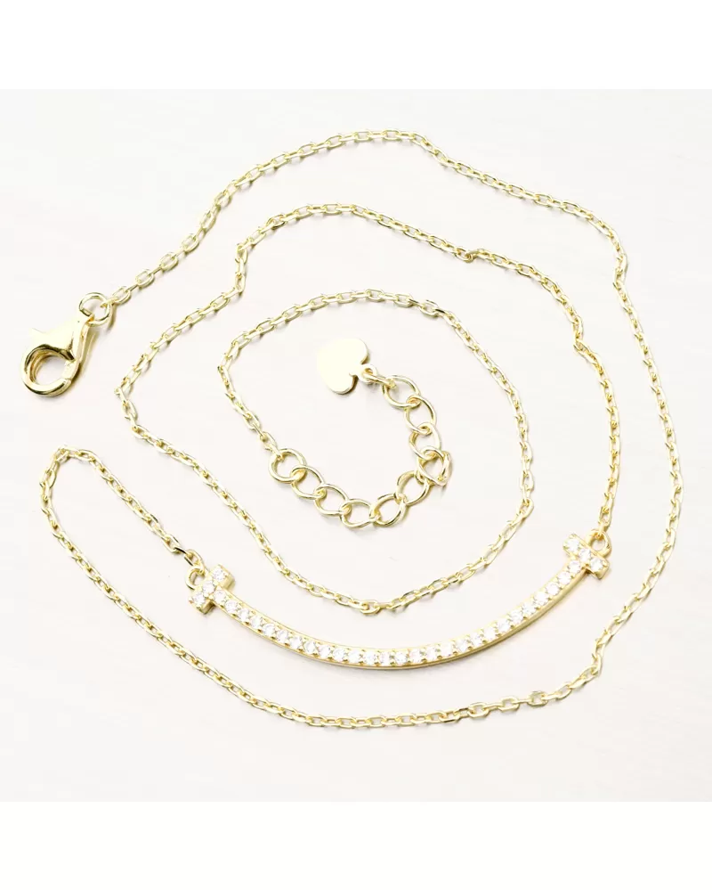 Náhrdelník tvorí jemnú retiazku typu anker a hlavnou ozdobou je prehnutá pevná línia uprostred, ktorá je osadená žiarivými zirkónmi. Zirkóny sú briliantového brusu, ktorý im dodáva dokonalú brilanciu, skvele odráža svetlo a krásne žiari z každého uhla pohľadu.