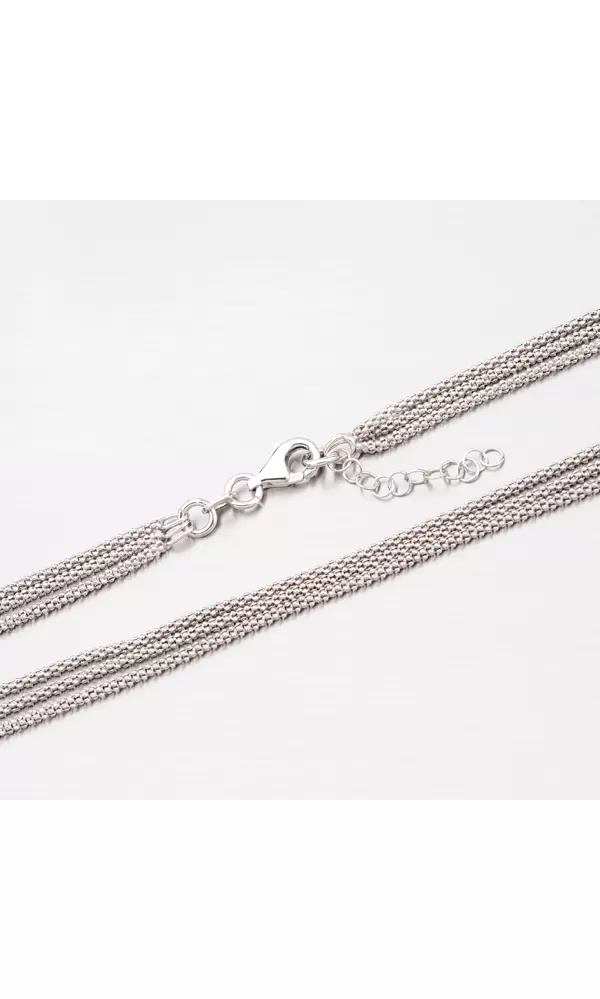 Tento krásny náhrdelník sa skladá z troch samostatných pletených retiazok v okrúhlom tvare, ktoré sú zdobené gravírovanými facetami robenými pomocou diamantového nástroja, ktoré dodávajú celému šperku maximálny lesk a brilanciu zo všetkých uhlov pohľadu. Náhrdelník je možné zapnúť na veľkosť 45 cm a vďaka pridanej nastaviteľnej retiazke až na veľkosť 48 cm. Povrch náhrdelníka je zušľachtený rhodiovaním. Ródium je ušľachtilý drahý kov zo skupiny platinových kovov. Rhodiovaním strieborných šperkov galvanickým nanášaním tohto drahého platinového kovu sa stáva povrch šperku tvrdší, stálejší a odolnejší voči vonkajším vplyvom ako je mechanický oter, poškriabanie, nabiehanie striebra, ľudský pot, kozmetické prípravky a ďalšie. Ródium je antialergické.