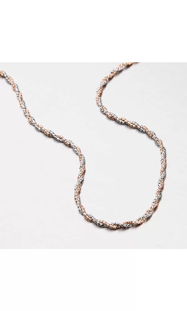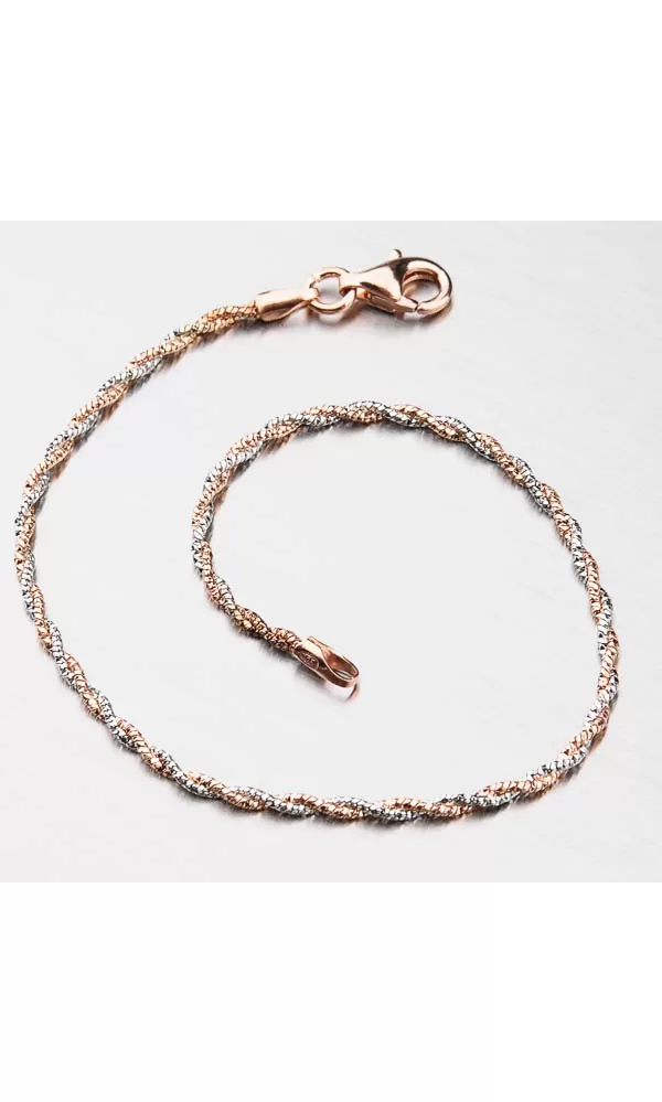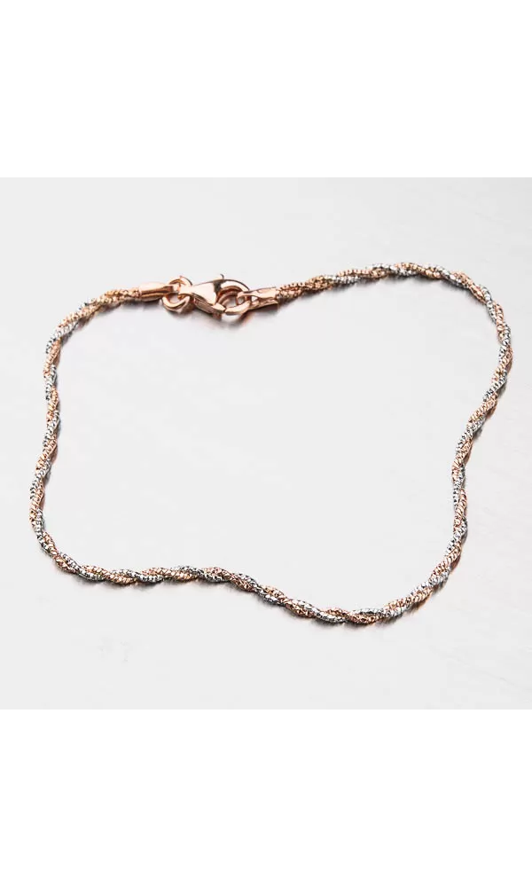 Chcete upútať decentným ale žiarivým šperkom? Tento náramok je zložené z dvoch retiazok, ktoré sú do seba zapletené. Retiazky sa od seba líšia tým, že jeden z nich je zdobený pozlátením PVD v ružovej farbe zlata. Aj napriek tomu svoju drobnosť je náramok pevný a veľmi prispôsobivý. Dámsky náramok je vyrobený zo striebra o rýdzosti 925/1000 v lesklej povrchovej úprave.