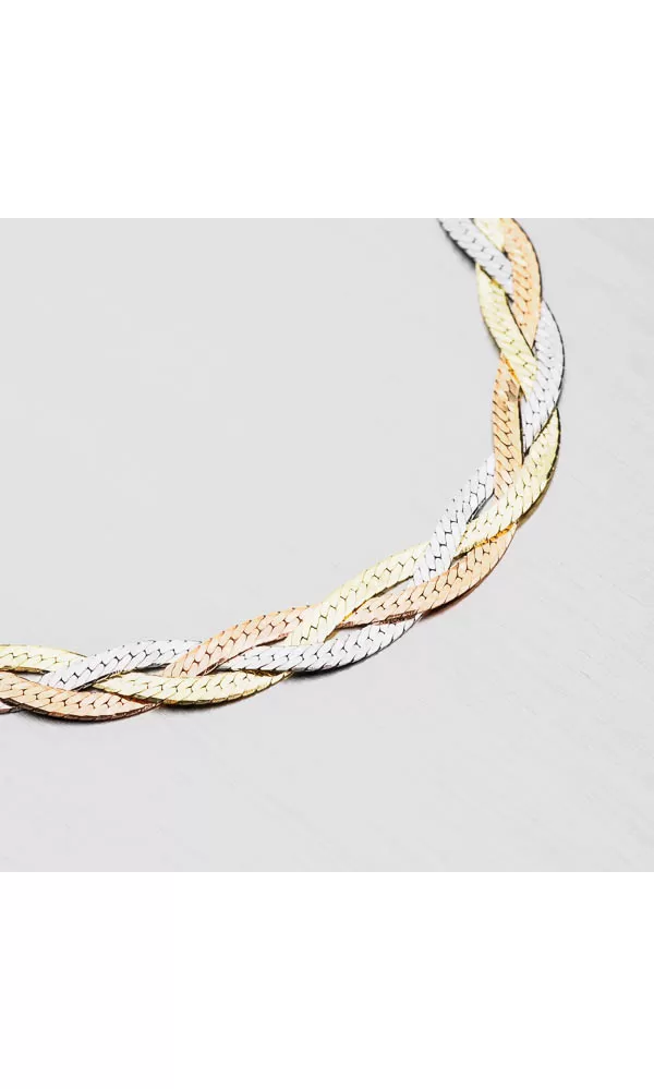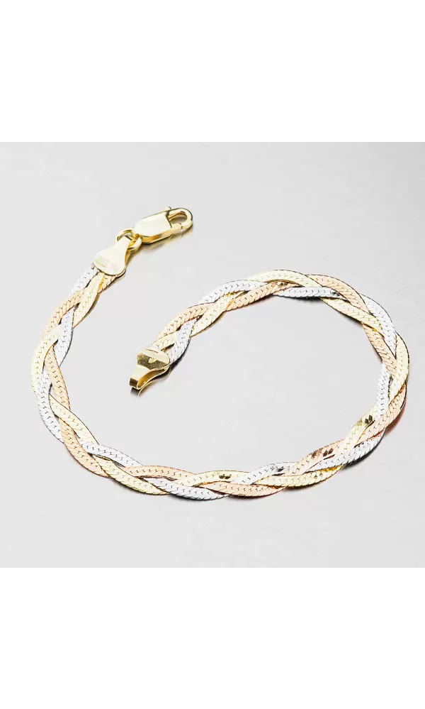 Buďte elegantný s týmto náramkom a oslňte okolie. Náramok je zložený z troch plochých retiazok, ktoré sú do seba spletené a tvoria tak vrkoč. Každá z retiazok má inú farbu a tým je náramok veľmi príťažlivý. Dve z retiazok sú zdobené technikou zlatenia PVD, ktorá im dodáva žltú a ružovú farbu zlata. Svojím prevedení náramok krásne priľne na zápästie. Je pevný a neprehliadnuteľný. Dámsky náramok je vyrobený zo striebra o rýdzosti 925/1000 v lesklej povrchovej úprave. Strieborný náramok zapnete karabínou.
