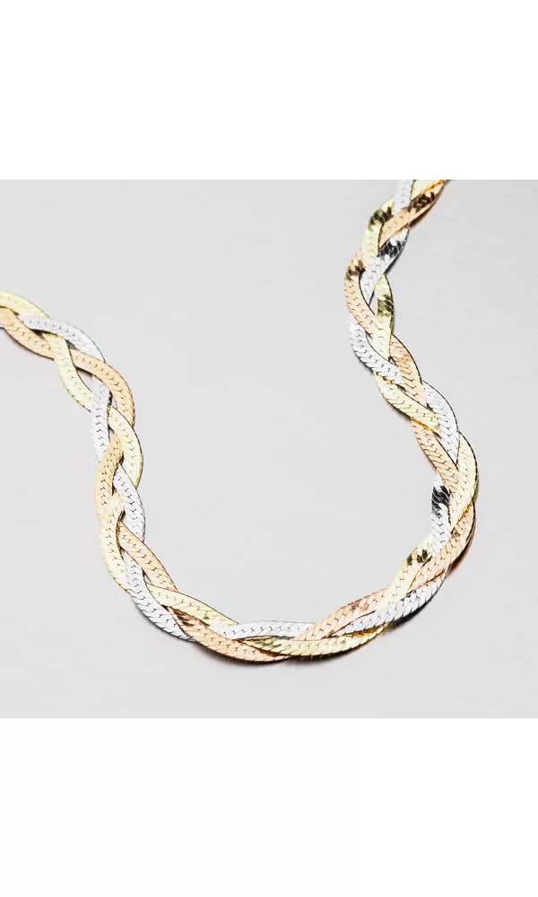 Buďte elegantný s týmto náramkom a oslňte okolie. Náramok je zložený z troch plochých retiazok, ktoré sú do seba spletené a tvoria tak vrkoč. Každá z… Celý popis