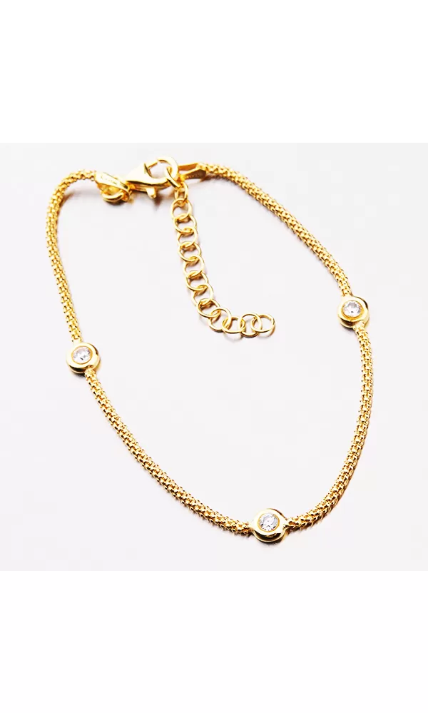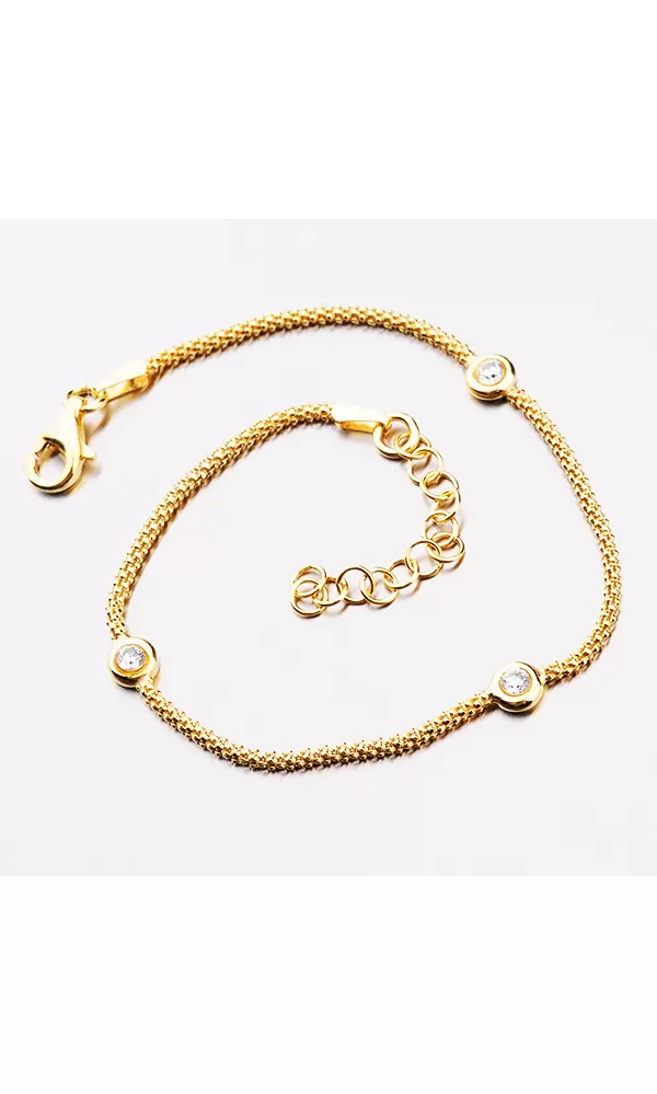 Zlatený náramok je tvorený retiazkou, ktorú zdobia zirkóny vsadené do strieborných krúžkov. Náramok je pozlátený technikou PVD vo farbe žltého zlata. Prednosťou zlatenia technológií PVD je vysoká tvrdosť a odolnosť proti oteru! Ide o hrubú vrstvu, ktorá preniká do pôvodného materiálu. Zlatenie technológií PVD sa dá porovnať s približne 12 mikrónmi galvanického zlatenia, čo je vysoká hodnota, ktorá pri bežnom nosení vydrží až 12 rokov. Dĺžka náramku je 17 cm s využitím prídavnej retiazky s dĺžkou 3 cm je možné náramok zapnúť až na dĺžku 20 cm.