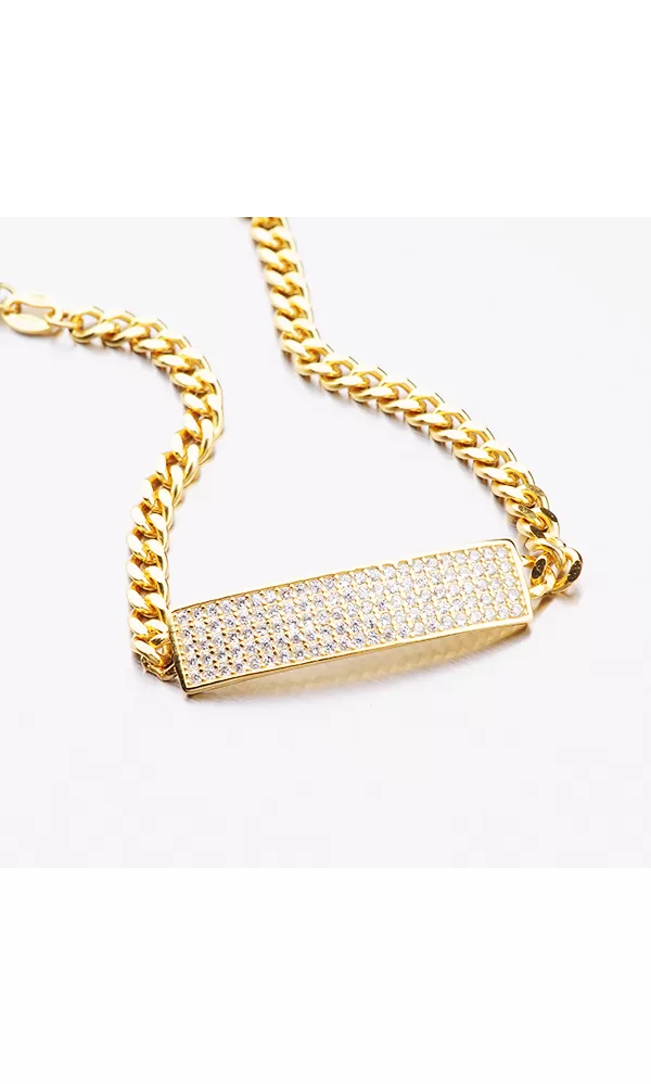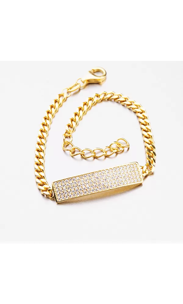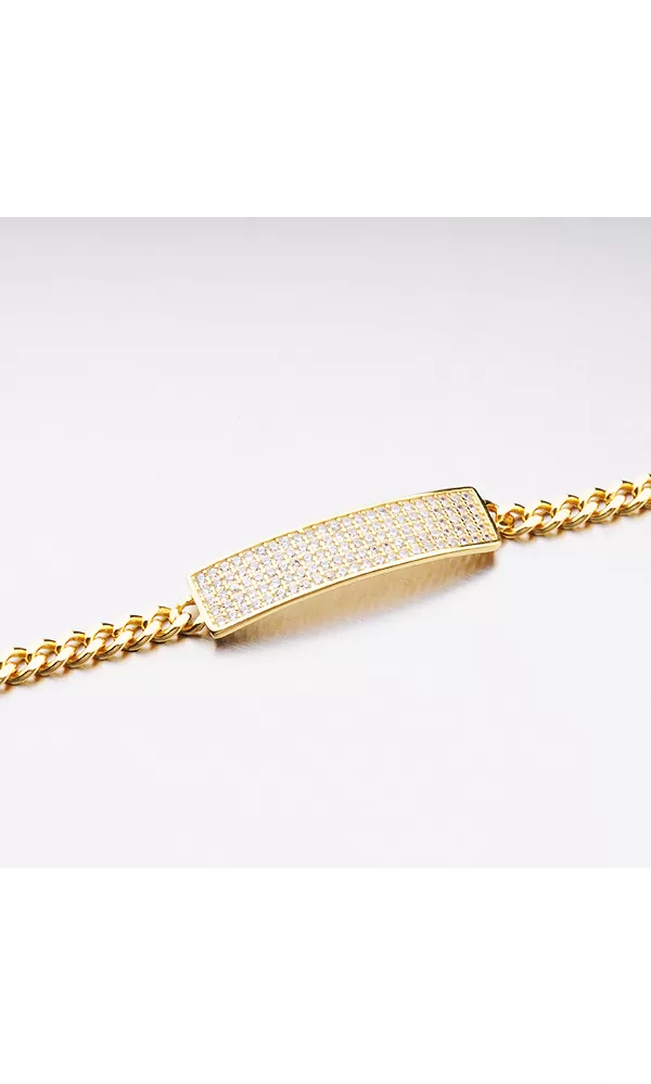 Ozdobte sa žiarivým náramok, ktorý je tvorený retiazkou pancer zdobený obdĺžnikom. Obdĺžnik je vysadený zirkónmi v briliantovom bruse. Strieborný náramok je pozlátený technikou PVD vo farbe žltého zlata. Náramok je pozlátený technikou PVD vo farbe žltého zlata. Prednosťou zlatenia technológií PVD je vysoká tvrdosť a odolnosť proti oteru! Ide o hrubú vrstvu, ktorá preniká do pôvodného materiálu. Zlatenie technológií PVD sa dá porovnať s približne 12 mikrónmi galvanického zlatenia, čo je vysoká hodnota, ktorá pri bežnom nosení vydrží až 12 rokov.
