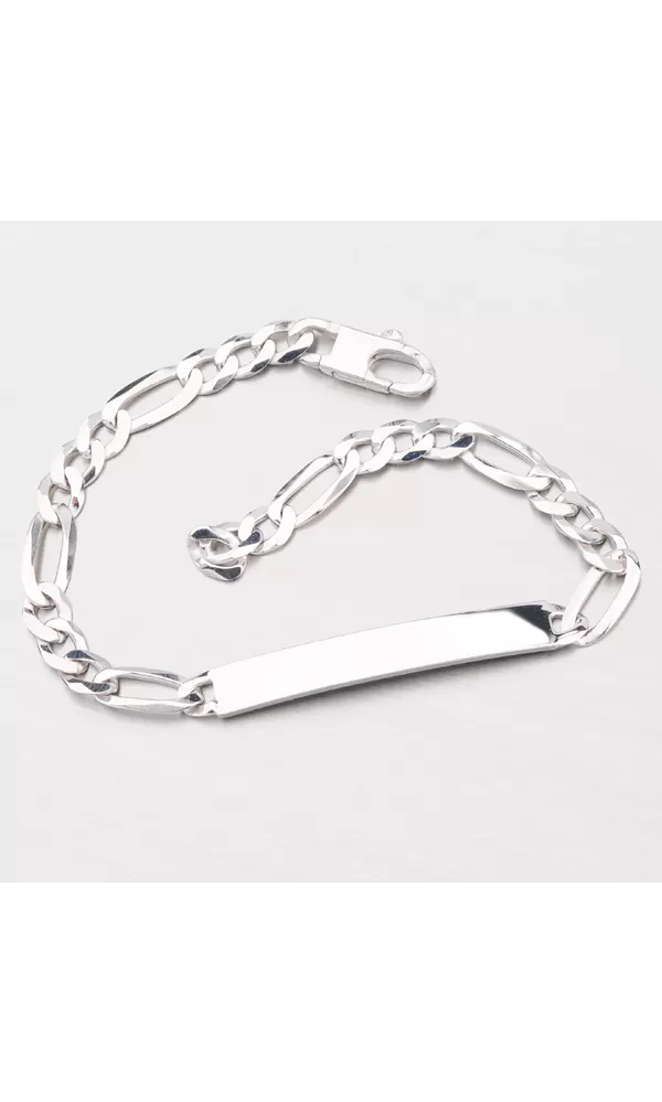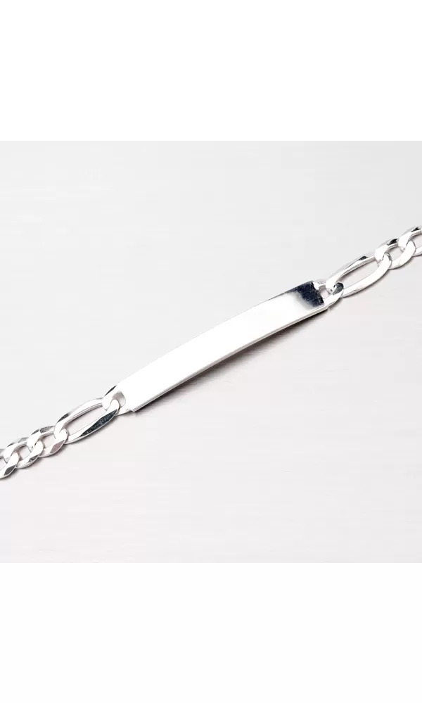 Tento veľmi jednoduchý, ale elegantný náramok je vyrobený zo striebra o rýdzosti 925/1000 v lesklej povrchovej úprave. Náramok je typu Figaro 3+1 s facetovanými hranami, ktoré sú robené pomocou diamantového nástroja a dodávajú šperku maximálny lesk a brilanciu zo všetkých uhlov. Na doštičku uprostred náramku je možné umiestniť rytinu z oboch strán podľa vášho priania. Celý povrch náramku je zušľachtený rhodiovaním. Ródium je ušľachtilý drahý kov zo skupiny platinových kovov. Rhodiovaním strieborných šperkov galvanickým nanášaním tohto drahého platinového kovu sa stáva povrch šperku tvrdší, stálejší a odolnejší voči vonkajším vplyvom ako je mechanický oter, poškriabanie, nabiehanie striebra, ľudský pot, kozmetické prípravky a ďalšie. Ródium je antialergické.