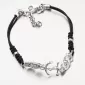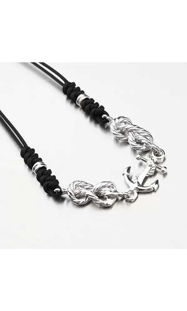 Moderný náramok vyrobený z čierneho textilu a strieborných častí. V strede je kotvový prívesok.