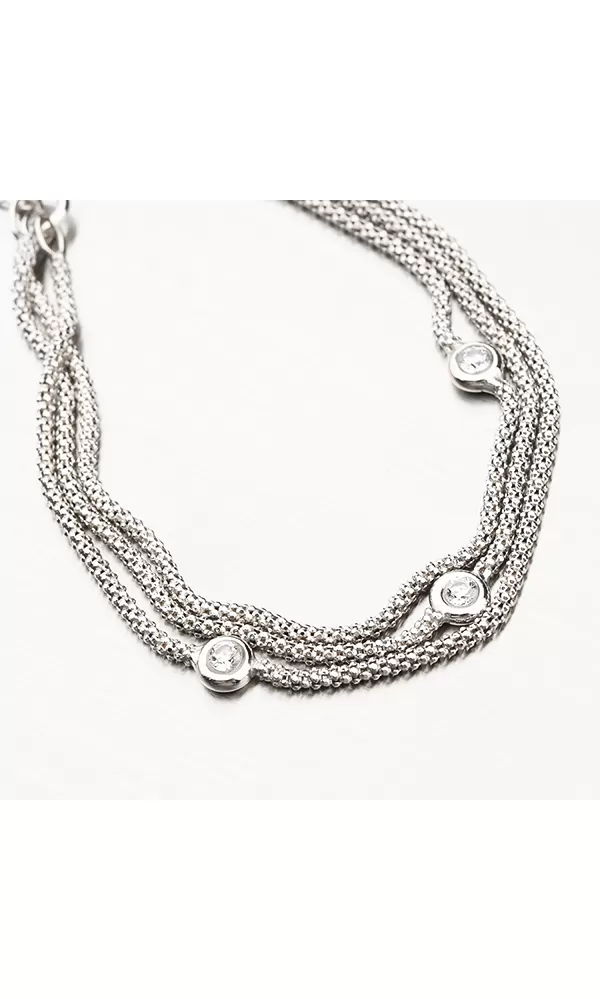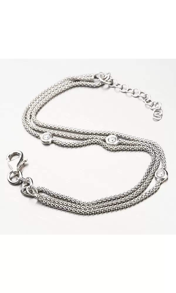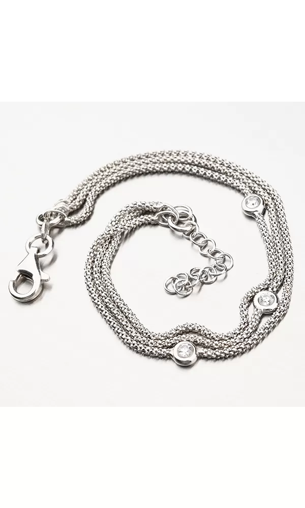 Elegantný náramok tvoria tri retiazky, ktoré sú zdobené zirkónmi v briliantovom bruse. Náramok sa zapína na karabínku. Dĺžka náramku je 17 cm, pri použití dodatočnej retiazky 3 cm je možné náramok zapnúť až do dĺžky 20 cm.