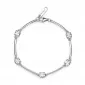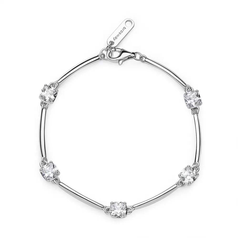 Veľmi slušivý náramok je vyrobený z rhodiovaného striebra rýdzosti 925/1000. Ródium je ušľachtilý drahý kov zo skupiny platinových kovov. Rhodiovaním strieborných šperkov galvanickým nanášaním tohto drahého kovu sa stáva povrch šperku tvrdší, stálejší a odolnejší voči vonkajším vplyvom ako je mechanický oter, poškriabanie, nabiehanie striebra, ľudský pot, kozmetické prípravky a ďalšie. Ródium je antialergické. Náramok je zdobený hranatými kubickými zirkónmi v bielej farbe. Dĺžka anáramku je 16 cm a zapína sa na spoľahlivú karabínu.