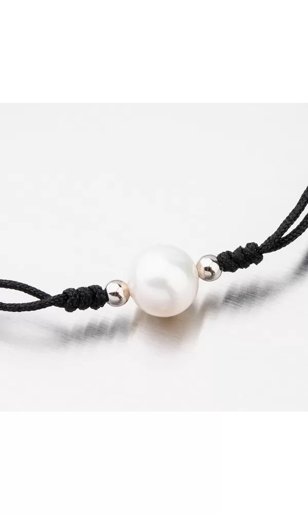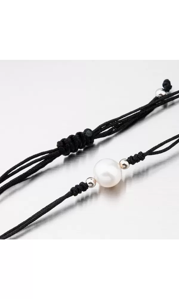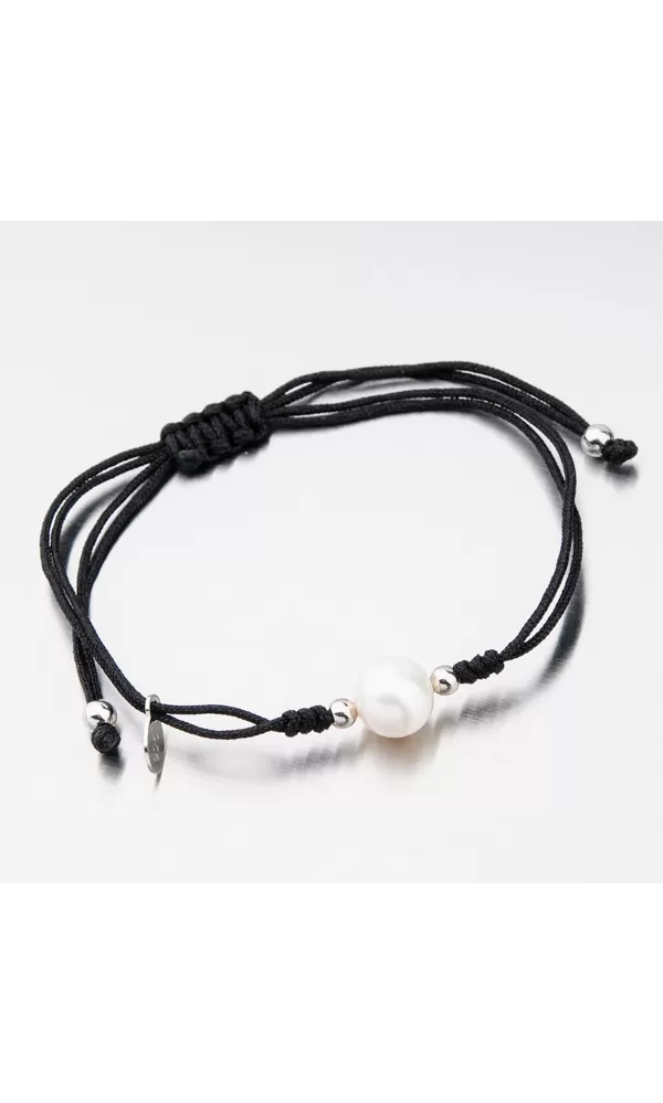 Módny dámsky náramok je tvorený z textilnej šnúrky v čiernej farbe, ktorá je zdobená perlou v bielej farbe doplnkami v striebre. Posuvná dĺžka náramku umožní pohodlné nosenie bez pretáčania. Minimálna dĺžka náramku je 16 cm, maximálna náramku 24 cm