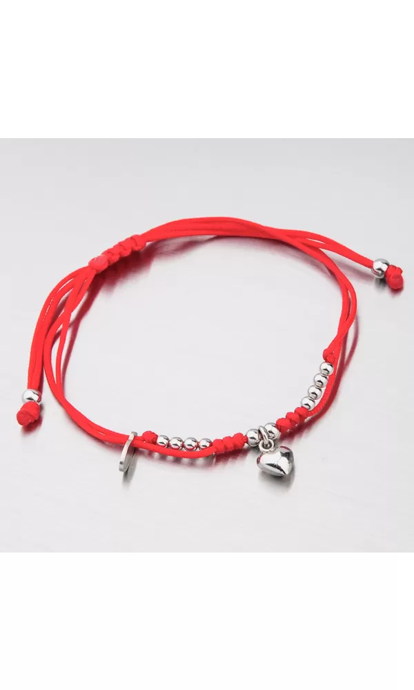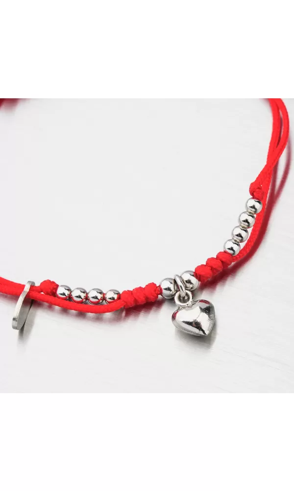 Módny dámsky náramok je tvorený z textilnej šnúrky v červenej farbe, ktorá je zdobená príveskom v tvare srdca a doplnkami v striebre. Posuvná dĺžka náramku umožní pohodlné nosenie bez pretáčania. Minimálna dĺžka náramku je 16 cm, maximálna náramku 24 cm