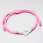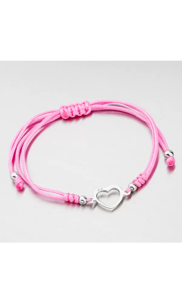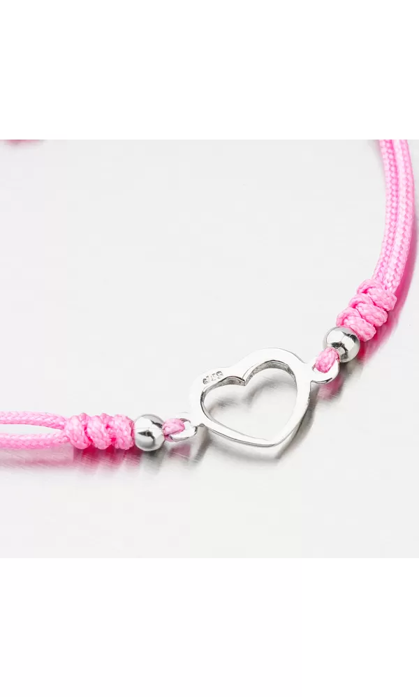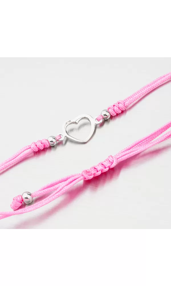 Módny dámsky náramok je tvorený z textilnej šnúrky v ružovej farbe, ktorá je zdobená príveskom v tvare srdca a doplnkami v striebre. Posuvná dĺžka náramku umožní pohodlné nosenie bez pretáčania. Minimálna dĺžka náramku je 16 cm, maximálna náramku 24 cm