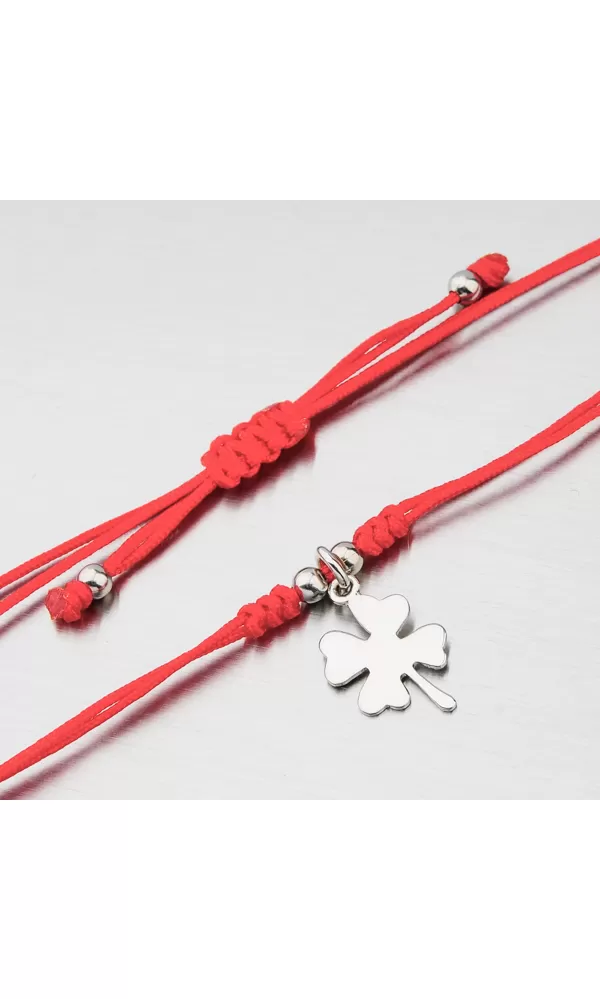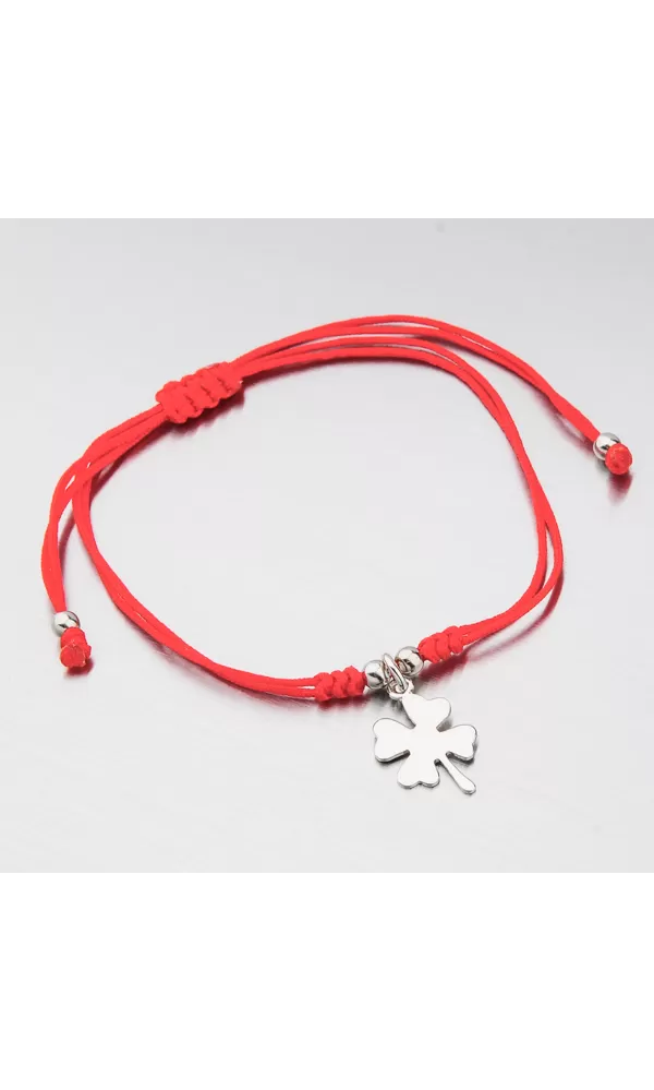 Módní dámský náramek je tvořen z textilní šňůrky v červené barvě, která je zdobená přívěskem ve tvaru čtyřlístku a doplňky ve stříbře. Posuvná délka náramku umožní pohodlné nošení bez přetáčení. Minimální délka náramku je 16 cm, maximální náramku 24 cm
