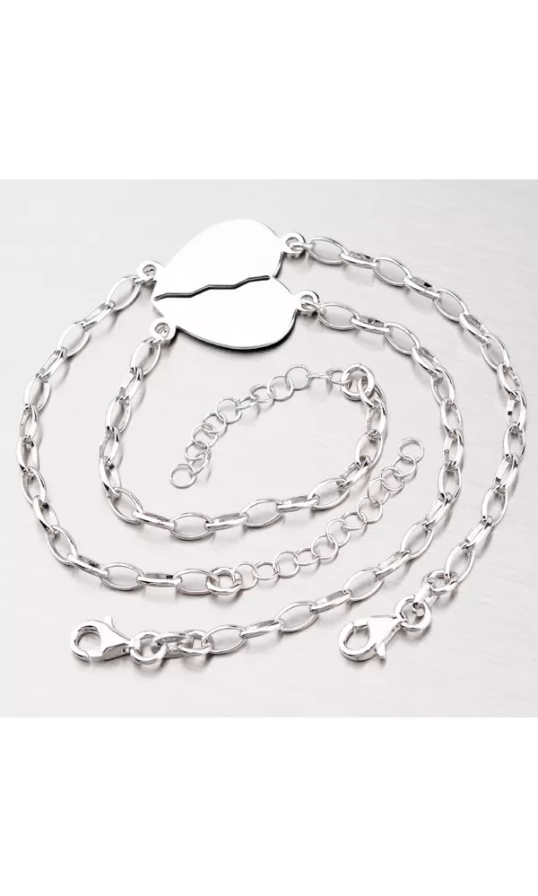 Romantický náramok pre zamilovaný pár. Po rozdelení srdiečka sa z jedného náramku vytvoria dva. Oba náramky budú mať polovicu srdca na ktoré je možné vyryť Vami vybraný text. Text je možné vyryť na obe strany srdca. Nádherný rhodiovaný náramok je vyrobený zo striebra o rýdzosti 925/1000 v lesklej povrchovej úprave so zapínaním na karabínu.